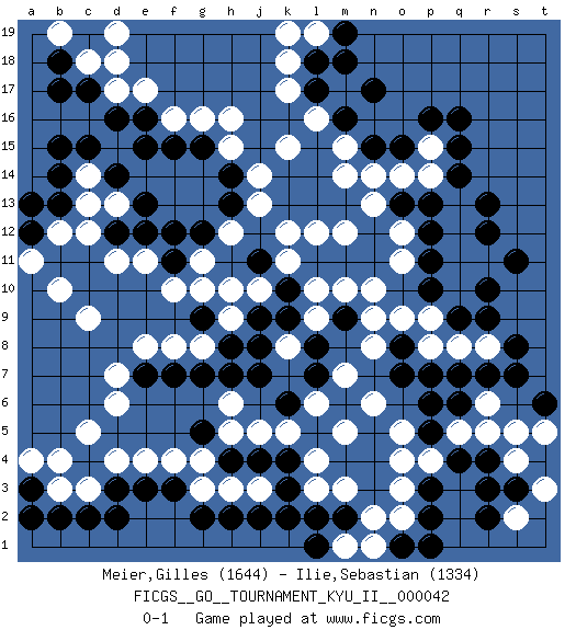 Last move : 0-1 2012 November 13 10:7:4 [Event "FICGS__GO__TOURNAMENT_KYU_II__000042"] [Site "FICGS"] [Date "2012.03.23"] [Round "1"] [Black "Meier,Gilles"] [White "Ilie,Sebastian"] [Result "0-1"] [Rating 1 "1644"] [Rating 2 "1334"] 1.q16 d17 2.q4 d4 3.c15 c12 4.e15 f16 5.b17 k17 6.n17 k15 7.f3 d6 8.d2 c3 9.c2 c9 10.r9 o3 11.p3 o4 12.p2 l4 13.j2 h3 14.h2 g3 15.g2 f4 16.e3 e4 17.k10 n10 18.l8 n8 19.p7 m7 20.p12 m12 21.j7 j3 22.b13 b12 23.b14 c18 24.b18 r6 25.q6 r5 26.r4 q5 27.p5 p4 28.r7 o5 29.p6 s4 30.s3 s5 31.s7 s2 32.r2 t3 33.r3 o2 34.t4 t5 35.t6 h10 36.j9 h9 37.h8 g8 38.g7 h6 39.h7 f8 40.k6 k8 41.l7 j10 42.k9 k11 43.l11 l12 44.m9 l10 45.m11 m10 46.n11 n9 47.m6 n6 48.f7 e8 49.g5 h5 50.h4 g4 51.j4 j5 52.k4 k5 53.k3 l3 54.k2 m5 55.m2 l6 56.e7 d7 57.j11 k12 58.g9 l9 59.j8 g10 60.c4 c5 61.d12 d11 62.e12 e11 63.f12 h12 64.f11 f10 65.b2 b3 66.e16 e17 67.f15 g16 68.n12 q10 69.r10 q11 70.r12 r11 71.s11 q12 72.r13 q13 73.q14 p14 74.p13 o14 75.q15 n13 76.p10 o11 77.p11 o12 78.l18 k18 79.l17 l16 80.m16 m15 81.n15 m14 82.o15 p15 83.p16 l19 84.m19 k19 85.m18 p8 86.q9 q8 87.q7 r8 88.s8 p9 89.g15 h15 90.h14 j14 91.h13 j13 92.g12 g11 93.o7 c13 94.d14 d13 95.e13 b19 96.c17 d18 97.o13 n14 98.d3 b4 99.o1 n1 100.p1 n2 101.l2 m3 102.a12 a11 103.a13 b10 104.c19 d19 105.d16 c14 106.b15 h16 107.o8 o9 108.a3 a4 109.a2 m1 110.l1 pass 0-1 Here are the names of the openings (joseki) played in the four corners : Corner d16 : d17 c15 Komoku (Somok, Xiao~mu`) 3-4 Point. The komoku (3-4) point is the traditional corner enclosure move.. Ikken Kakari (Hankan Keolch'im, Yi Gua`jiao~, 1-Space Low Pincer). The small knight move is the basic approach move to the 3-4 point stone. It has been continually used for over four centuries. There are limitless variations, with new moves constantly being discovered. Black 2 opens the door to a treaure store of joseki. Corner d4 : d4 f3 Hoshi (Hwajeom, Seongjeom, Xingwei`) 4-4 Point. The star or hoshi (4-4) point, emphasizing influence at the potential expense of territory. Ikken Kakari (Hankan Keolch'im, Yi Gua`jiao~, 1-Space Low Approach). Black 2 is the standard approach move to the 4-4. Player White won this Go (weiqi, baduk) game. Follow this game move after move (download)Don't overlook the edge of the board. (Anonymous) That's absurd. I love it. (Gregory House, House M.D.)