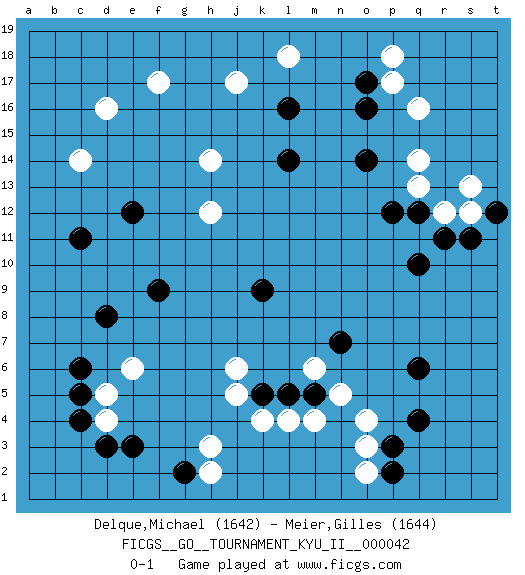 Last move : 0-1 2012 June 6 15:22:44 [Event "FICGS__GO__TOURNAMENT_KYU_II__000042"] [Site "FICGS"] [Date "2012.03.23"] [Round "1"] [Black "Delque,Michael"] [White "Meier,Gilles"] [Result "0-1"] [Rating 1 "1642"] [Rating 2 "1644"] 1.q4 q16 2.c4 d16 3.q10 o3 4.p3 o4 5.q6 k4 6.o17 p17 7.o16 q14 8.l16 f17 9.e3 h3 10.c11 c14 11.d8 j17 12.k9 r12 13.r11 s12 14.s11 h12 15.e12 l18 16.l14 h14 17.m5 m4 18.l5 l4 19.k5 j5 20.o14 j6 21.n7 n5 22.f9 m6 23.q12 q13 24.p12 e6 25.c6 d5 26.c5 d4 27.d3 p18 28.g2 h2 29.p2 o2 30.t12 s13 0-1 This go game has been lost on time (started : 2012.03.23 11:55:50) Here are the names of the openings (joseki) played in the four corners : Corner q4 : q4 o3 Hoshi (Hwajeom, Seongjeom, Xingwei`) 4-4 Point. The star or hoshi (4-4) point, emphasizing influence at the potential expense of territory. Ikken Kakari (Hankan Keolch'im, Yi Gua`jiao~, 1-Space Low Approach). White 2 is the standard approach move to the 4-4. Corner q16 : q16 o17 Hoshi (Hwajeom, Seongjeom, Xingwei`) 4-4 Point. The star or hoshi (4-4) point, emphasizing influence at the potential expense of territory. Ikken Kakari (Hankan Keolch'im, Yi Gua`jiao~, 1-Space Low Approach). Black 2 is the standard approach move to the 4-4. Player White won this Go (weiqi, baduk) game. Follow this game move after move (download)Error is one of the sources of transformation. (Pierre Audouard) Always be a first-rate version of yourself, instead of a second-rate version of somebody else. (Judy Garland)