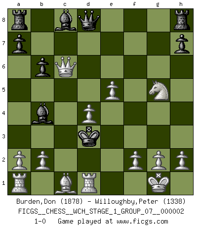 Last move : 1-0 2007 February 11 22:49:1 [Event "FICGS__CHESS__WCH_STAGE_1_GROUP_07__000002"] [Site "FICGS"] [Date "2007.01.16"] [Round "1"] [White "Burden,Don"] [Black "Willoughby,Peter"] [Result "1-0"] [WhiteElo "1878"] [BlackElo "1338"] 1.e4 e6 2.d4 d5 3.Nd2 Nf6 4.e5 Nfd7 5.c3 c5 6.Bd3 Nc6 7.Ne2 cxd4 8.cxd4 Be7 9.O-O Qb6 10.Nf3 f6 11.Nf4 f5 12.Nxe6 Nf8 13.Nxg7+ Kd7 14.Nxf5 Bb4 15.Ne3 Ne6 16.Nxd5 Qd8 17.Bf5 b6 18.Bxe6+ Kxe6 19.Ng5+ Kxd5 20.Qf3+ Kc4 21.Qxc6+ Kd3 22.Rd1+ 1-0 French : Tarrasch, Closed variation Kingside Castling by player White (move 9) Player White won this chess game. Follow this game move after move (download)Fischer prefers to enter Chess history alone. (Miguel Najdorf) Sicherlich können nur Meister einen Stil haben. Daß ein nicht-Meister auch nur ein einziges Mal in seinem Leben eine Partie folgerecht durchführte, habe ich niemals bemerkt. (Emanuel Lasker) El Rey es una pieza de pelea. ¡Usenlo!. (Wilhelm Steinitz) Roi des jeux et jeu des rois, les échecs portent en eux un sentiment d'infini. Ils donnent à celui qui s'est efforcé d'en approfondir les arcanes l'impression de n'être pas à la mesure de l'homme; en fait, ils constituent un résumé de l'univers, un microcosme, et figurent cette grande échelle qui, dans les plans de la lumière descend jusqu'à la matière, qui des abîmes insondables remonte jusqu'en l'infini de Dieu. (Pyrame) There are two kinds of tragedy in this world, one is not getting what you want and the other is getting. (Lord of war)