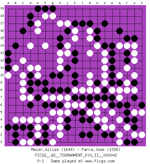 Last move : 0-1 2012 May 4 21:21:20 [Event "FICGS__GO__TOURNAMENT_KYU_II__000042"] [Site "FICGS"] [Date "2012.03.23"] [Round "1"] [Black "Meier,Gilles"] [White "Parra,Jose"] [Result "0-1"] [Rating 1 "1644"] [Rating 2 "1335"] 1.q16 d4 2.c16 q4 3.f3 d7 4.d2 e16 5.d17 e17 6.d18 h17 7.o17 q14 8.r6 r8 9.p6 o4 10.s4 r3 11.s3 d14 12.b14 c12 13.s15 s14 14.r15 r14 15.b3 b4 16.c3 c4 17.l17 r11 18.l2 h3 19.o2 p3 20.p2 q2 21.n3 n4 22.m4 n6 23.s7 s8 24.o7 m5 25.l4 s2 26.g10 s5 27.r5 j5 28.j4 h4 29.k5 j6 30.k10 k6 31.l5 l6 32.j3 t5 33.t6 n8 34.o8 o9 35.p9 q7 36.q6 p8 37.n7 m8 38.m7 l8 39.m6 n5 40.r4 o3 41.m2 t2 42.s9 r9 43.q9 q10 44.p10 o10 45.p11 q8 46.l7 k8 47.k7 j7 48.j8 o11 49.n9 m10 50.r1 q1 51.s1 o6 52.p7 p5 53.p12 o12 54.p13 o13 55.p14 s10 56.k9 m9 57.h8 g5 58.o14 m13 59.d10 c10 60.d9 c9 61.d8 c8 62.a11 b11 63.a13 a10 64.a12 d11 65.e7 f4 66.k13 n14 67.n15 m15 68.n16 k15 69.j16 k16 70.k17 j17 71.h15 j14 72.h14 j13 73.k12 m16 74.m17 h13 75.g19 g18 76.e19 f18 77.f19 f14 78.r12 s12 79.r13 s13 80.d6 c7 81.f6 e10 82.f9 g7 83.g6 h7 84.h6 h5 85.e9 e11 86.g8 h11 87.h10 f7 88.j11 h12 89.f8 e3 90.f2 e2 91.e1 h2 92.d3 e4 93.b2 c1 94.a3 d1 95.f1 g1 96.b1 g3 0-1 Here are the names of the openings (joseki) played in the four corners : Corner d4 : d4 f3 Hoshi (Hwajeom, Seongjeom, Xingwei`) 4-4 Point. The star or hoshi (4-4) point, emphasizing influence at the potential expense of territory. Ikken Kakari (Hankan Keolch'im, Yi Gua`jiao~, 1-Space Low Approach). Black 2 is the standard approach move to the 4-4. Corner d16 : c16 e16 Komoku (Somok, Xiao~mu`) 3-4 Point. The komoku (3-4) point is the traditional corner enclosure move.. Ikken Takagakari (Hankan Nop'dakeolch'im, Yi Gaogua`jiao~, 1-Space High Approach). The 5-4 approach move has become more popular in modern times, as modern Go emphasizes speed and influence. Corner q4 : q4 r6 Hoshi (Hwajeom, Seongjeom, Xingwei`) 4-4 Point. The star or hoshi (4-4) point, emphasizing influence at the potential expense of territory. Ikken Kakari (Hankan Keolch'im, Yi Gua`jiao~, 1-Space Low Approach). Black 2 is the standard approach move to the 4-4. Player White won this Go (weiqi, baduk) game. Follow this game move after move (download)Never try to cut bamboo joints. (Anonymous) Luck never made a man wise. (Seneca, Letters to Lucilius)