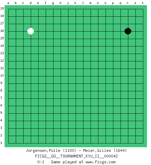 Last move : 0-1 2012 April 24 0:7:18 [Event "FICGS__GO__TOURNAMENT_KYU_II__000042"] [Site "FICGS"] [Date "2012.03.23"] [Round "1"] [Black "Jorgensen,Polle"] [White "Meier,Gilles"] [Result "0-1"] [Rating 1 "1100"] [Rating 2 "1644"] 1.r16 d16 0-1 This go game has been lost on time (started : 2012.03.23 11:55:50) Here are the names of the openings (joseki) played in the four corners : Player White won this Go (weiqi, baduk) game. Follow this game move after move (download)When your opponent has two weak groups, attack them both at once. (Anonymous) For to win one hundred victories in one hundred battles is not the acme of skill. To subdue the enemy without fighting is the acme of skill. (Sun Tzu)