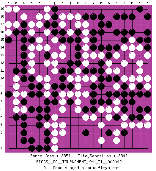 Last move : 1-0 2012 December 23 6:13:47 [Event "FICGS__GO__TOURNAMENT_KYU_II__000042"] [Site "FICGS"] [Date "2012.03.23"] [Round "1"] [Black "Parra,Jose"] [White "Ilie,Sebastian"] [Result "1-0"] [Rating 1 "1335"] [Rating 2 "1334"] 1.r16 d17 2.q3 d4 3.d15 d12 4.c17 c18 5.c16 e18 6.c13 d13 7.c12 d11 8.c11 d14 9.c14 e15 10.g17 d16 11.c15 f16 12.j17 l17 13.k16 l16 14.k14 l15 15.k15 m13 16.k12 p17 17.n17 o16 18.n18 r14 19.n16 n15 20.p18 q17 21.q18 r17 22.r18 s18 23.o17 p15 24.d10 e10 25.e9 f10 26.d9 r6 27.r8 r10 28.q6 q5 29.r5 r4 30.s5 q4 31.f3 h3 32.c3 d3 33.c4 d5 34.c5 c6 35.d6 b6 36.d2 e2 37.c2 e3 38.b5 d7 39.e6 e7 40.f6 c8 41.f7 b10 42.c10 b9 43.f2 f4 44.g4 g3 45.e1 g2 46.f1 g1 47.d1 g5 48.e4 h4 49.e5 p3 50.r7 p6 51.q7 s4 52.s6 k10 53.l11 l10 54.n11 m10 55.m11 o9 56.b11 b7 57.h10 h7 58.o3 p2 59.l3 n2 60.o7 o6 61.n7 n6 62.m7 l5 63.p10 p9 64.q9 q10 65.o10 k8 66.r12 q12 67.q13 r13 68.q11 s12 69.r11 s11 70.n9 p7 71.p8 p11 72.j7 k7 73.j9 l8 74.j11 j8 75.g14 g12 76.f13 e14 77.l18 k18 78.m18 k17 79.m15 l14 80.n14 o15 81.m14 n13 82.m16 l12 83.o14 k11 84.k13 l13 85.o13 o11 86.n10 o12 87.n12 h18 88.g18 h17 89.h16 j18 90.g16 j16 91.j15 f18 92.g19 h13 93.j12 h14 94.h15 f12 95.s17 s16 96.p16 t17 97.q16 s17 98.q15 q14 99.p14 p13 100.b18 b19 101.a18 f14 102.g9 f9 103.g8 g13 104.s19 r15 105.s9 r9 106.o8 s10 107.m6 m5 108.s8 t5 109.t6 t4 110.g7 h6 111.a8 b8 112.d8 f8 113.e8 j10 114.h11 k9 115.h9 g15 116.s15 f19 117.t18 t19 118.n5 n4 119.t18 p9 120.t16 q8 121.p5 o5 122.q9 b17 123.q8 a17 124.c7 a19 125.b16 a16 126.a15 s14 127.l6 k6 128.t15 t9 129.t8 t10 130.t14 t13 131.f17 e17 132.m8 g11 133.f5 g4 134.m9 h8 135.pass pass 136.pass 1-0 Here are the names of the openings (joseki) played in the four corners : Corner d16 : d17 d15 Komoku (Somok, Xiao~mu`) 3-4 Point. The komoku (3-4) point is the traditional corner enclosure move.. Ikken Takagakari (Hankan Nop'dakeolch'im, Yi Gaogua`jiao~, 1-Space High Approach). The 5-4 approach move has become more popular in modern times, as modern Go emphasizes speed and influence. Corner q16 : r16 l17 Komoku (Somok, Xiao~mu`) 3-4 Point. The komoku (3-4) point is the traditional corner enclosure move.. Corner d4 : d4 e9 Hoshi (Hwajeom, Seongjeom, Xingwei`) 4-4 Point. The star or hoshi (4-4) point, emphasizing influence at the potential expense of territory. Corner q4 : q3 r6 Komoku (Somok, Xiao~mu`) 3-4 Point. The komoku (3-4) point is the traditional corner enclosure move.. Niken Kakari (Dukan Keolch'im, E`r Gua`jiao~, 2-Space Low Approach). White 2 is used with friendly forces backing it up. Its purpose is to prevent a pincer. Locally it results in a loss, but may be appropriate fuseki strategy. It was popular in the late 1950s and early 1960s, but is not seen often nowadays, having been replaced by the one-space high approach, with which it has points in common. Player Black won this Go (weiqi, baduk) game. Follow this game move after move (download)Keshi is worth as much as an invasion ! (Anonymous) Success without honor is an unseasoned dish; it will satisfy your hunger, but it won't taste good. (Joe Paterno)