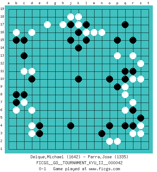 Last move : 0-1 2012 May 30 2:45:52 [Event "FICGS__GO__TOURNAMENT_KYU_II__000042"] [Site "FICGS"] [Date "2012.03.23"] [Round "1"] [Black "Delque,Michael"] [White "Parra,Jose"] [Result "0-1"] [Rating 1 "1642"] [Rating 2 "1335"] 1.q4 d16 2.r15 d4 3.q17 q6 4.o4 q9 5.k16 f17 6.d10 n16 7.k14 k17 8.l17 l16 9.l15 m16 10.j17 k18 11.j15 j18 12.c13 h17 13.j4 r3 14.r4 s4 15.s5 s3 16.r6 p2 17.n3 o2 18.b15 b16 19.e3 d3 20.e4 d6 21.c8 c7 22.r11 r7 23.k10 r10 24.q11 c11 25.c15 r13 26.p15 p13 27.q10 s10 28.p9 q8 29.o10 s12 30.b8 d11 31.b7 b6 0-1 This go game has been lost on time (started : 2012.03.23 11:55:50) Here are the names of the openings (joseki) played in the four corners : Corner q4 : q4 q6 Hoshi (Hwajeom, Seongjeom, Xingwei`) 4-4 Point. The star or hoshi (4-4) point, emphasizing influence at the potential expense of territory. Ikken Takagakari (Hankan Nop'dakeolch'im, Yi Gaojia, 1-Space High Approach). Black typically responds at 6-4 or 3-10. Black 4-10 is played when Black finds play on the right side advantageous. Black 4-8 or 3-8 may be played when Black has support at top. Corner d4 : d4 j4 Hoshi (Hwajeom, Seongjeom, Xingwei`) 4-4 Point. The star or hoshi (4-4) point, emphasizing influence at the potential expense of territory. Player White won this Go (weiqi, baduk) game. Follow this game move after move (download)Don't defend - extend ! (Bill Taylor) Looking at the proliferation of personal web pages on the Net, it looks like very soon everyone on Earth will have 15 megabytes of fame. (M.G. Sriram)