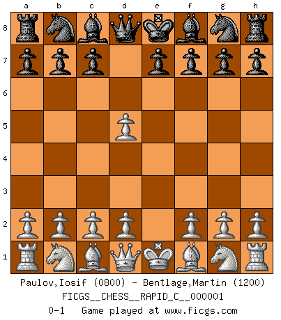 Last move : 0-1 2006 May 16 8:15:13 [Event "FICGS__CHESS__RAPID_C__000001"] [Site "FICGS"] [Date "2006.05.12"] [Round "1"] [White "Paulov,Iosif"] [Black "Bentlage,Martin"] [Result "0-1"] [WhiteElo "0800"] [BlackElo "1200"] 1.e4 d5 2.exd5 0-1 Scandinavian (centre counter) defense Player Black won this chess game. Follow this game move after move (download)On the chessboard, lies and hypocrisy do not survive long. (Emanuel Lasker) Wer mein Gambit spielt, muß bereit sein, alle Brücken hinter sich abzubrechen. Es verändert den ganzen Menschen. Es wirkt wie ein Zauberstab und fördert verkümmerte, gute Charakter- eigenschaften wieder zu Tage. (Emil Joseph Diemer) Evita las multitudes. Haz independientemente tu propio razonamiento. Trata de ser el jugador de Ajedrez, no la pieza de Ajedrez. (Ralph Charell) Toute estimation doit être constamment réévaluée. (Jacob Estrin) The age of a woman doesn't mean a thing. The best tunes are played on the oldest fiddles. (Ralph Waldo Emerson)