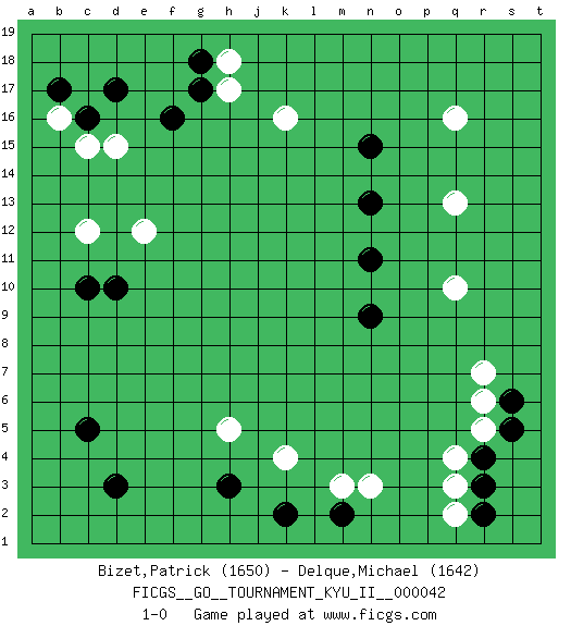 Last move : 1-0 2012 August 21 1:48:58 [Event "FICGS__GO__TOURNAMENT_KYU_II__000042"] [Site "FICGS"] [Date "2012.03.23"] [Round "1"] [Black "Bizet,Patrick"] [White "Delque,Michael"] [Result "1-0"] [Rating 1 "1650"] [Rating 2 "1642"] 1.d3 q16 2.d17 q4 3.d10 k4 4.c5 q10 5.r3 q3 6.r4 r5 7.s5 r6 8.s6 r7 9.r2 q2 10.h3 h5 11.k2 m3 12.m2 n3 13.n9 k16 14.n11 c15 15.c16 d15 16.f16 c12 17.c10 e12 18.n13 q13 19.n15 h17 20.g17 h18 21.g18 b16 22.b17 1-0 This go game has been lost on time (started : 2012.03.23 11:55:50) Here are the names of the openings (joseki) played in the four corners : Corner q4 : q4 r3 Hoshi (Hwajeom, Seongjeom, Xingwei`) 4-4 Point. The star or hoshi (4-4) point, emphasizing influence at the potential expense of territory. Corner q16 : q16 n11 Hoshi (Hwajeom, Seongjeom, Xingwei`) 4-4 Point. The star or hoshi (4-4) point, emphasizing influence at the potential expense of territory. Corner d16 : d17 c15 Komoku (Somok, Xiao~mu`) 3-4 Point. The komoku (3-4) point is the traditional corner enclosure move.. Ikken Kakari (Hankan Keolch'im, Yi Gua`jiao~, 1-Space Low Pincer). The small knight move is the basic approach move to the 3-4 point stone. It has been continually used for over four centuries. There are limitless variations, with new moves constantly being discovered. White 2 opens the door to a treaure store of joseki. Player Black won this Go (weiqi, baduk) game. Follow this game move after move (download)Territory is a closed space where time no longer exists. The transformation around it slower alter it, and sometimes it cracks open like a rotten egg at the least shock. (Pierre Audouard) I just play for fun. (Anna Kournikova)
