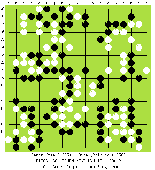 Last move : 1-0 2012 November 27 10:52:19 [Event "FICGS__GO__TOURNAMENT_KYU_II__000042"] [Site "FICGS"] [Date "2012.03.23"] [Round "1"] [Black "Parra,Jose"] [White "Bizet,Patrick"] [Result "1-0"] [Rating 1 "1335"] [Rating 2 "1650"] 1.q17 d3 2.r4 c16 3.d5 c5 4.c6 c4 5.d6 e17 6.c10 r15 7.r13 r17 8.r18 s17 9.e3 d2 10.e2 b6 11.b7 q16 12.p17 p16 13.o17 h4 14.d4 b3 15.j3 h6 16.h3 p3 17.n3 r3 18.s3 q4 19.r5 q5 20.r7 q6 21.r6 h8 22.p7 o2 23.n2 o5 24.n6 o4 25.n5 h10 26.h7 j7 27.g7 j6 28.j8 k8 29.j9 k9 30.j10 k10 31.j11 l6 32.n4 r2 33.l11 m8 34.n9 m9 35.n10 j4 36.k4 k5 37.l4 c13 38.o16 o15 39.n15 o14 40.h16 h18 41.j17 k18 42.j18 j19 43.l17 q12 44.r12 q13 45.r11 d11 46.e10 e11 47.f11 f12 48.g11 g12 49.h11 g16 50.d10 g15 51.s2 s1 52.q2 q3 53.l18 j14 54.g6 g5 55.g4 h5 56.f5 q11 57.q10 s14 58.g18 g17 59.h17 f18 60.h19 t11 61.s10 o11 62.p6 p5 63.h13 h15 64.e12 d12 65.e13 g13 66.g14 f14 67.d18 c17 68.f19 e19 69.e18 g19 70.d13 c12 71.f19 c18 72.f17 e16 73.b11 b12 74.b2 c2 75.b1 a2 76.d1 1-0 Here are the names of the openings (joseki) played in the four corners : Corner d4 : d3 d5 Komoku (Somok, Xiao~mu`) 3-4 Point. The komoku (3-4) point is the traditional corner enclosure move.. Ikken Takagakari (Hankan Nop'dakeolch'im, Yi Gaogua`jiao~, 1-Space High Approach). The 5-4 approach move has become more popular in modern times, as modern Go emphasizes speed and influence. Corner q16 : q17 r15 Komoku (Somok, Xiao~mu`) 3-4 Point. The komoku (3-4) point is the traditional corner enclosure move.. Ikken Kakari (Hankan Keolch'im, Yi Gua`jiao~, 1-Space Low Pincer). The small knight move is the basic approach move to the 3-4 point stone. It has been continually used for over four centuries. There are limitless variations, with new moves constantly being discovered. White 2 opens the door to a treaure store of joseki. Corner q4 : r4 p3 Komoku (Somok, Xiao~mu`) 3-4 Point. The komoku (3-4) point is the traditional corner enclosure move.. Ikken Kakari (Hankan Keolch'im, Yi Gua`jiao~, 1-Space Low Pincer). The small knight move is the basic approach move to the 3-4 point stone. It has been continually used for over four centuries. There are limitless variations, with new moves constantly being discovered. White 2 opens the door to a treaure store of joseki. Player Black won this Go (weiqi, baduk) game. Follow this game move after move (download)Don't make territory near thickness. (Anonymous) If I had no sense of humor, I would long ago have committed suicide. (Mahatma Gandhi)