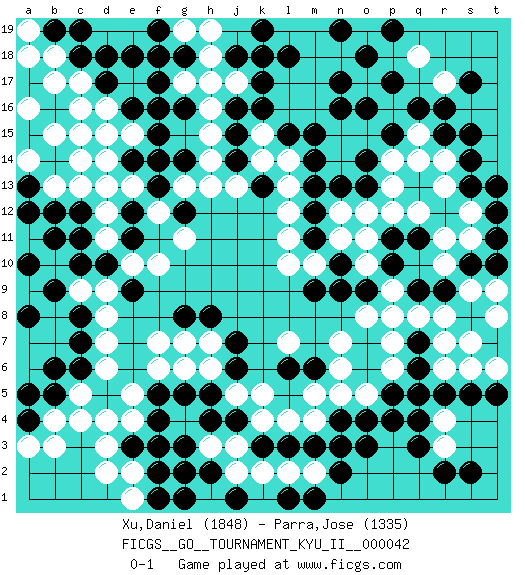Last move : 0-1 2012 May 10 10:31:36 [Event "FICGS__GO__TOURNAMENT_KYU_II__000042"] [Site "FICGS"] [Date "2012.03.23"] [Round "1"] [Black "Xu,Daniel"] [White "Parra,Jose"] [Result "0-1"] [Rating 1 "1848"] [Rating 2 "1335"] 1.q16 d4 2.q3 d16 3.r9 q5 4.o4 r3 5.r2 r4 6.s2 r8 7.s8 r7 8.q9 r14 9.r15 q14 10.o16 s7 11.r12 s9 12.s10 t8 13.o14 p13 14.o13 p12 15.o9 o11 16.f17 h17 17.f15 d14 18.d18 c17 19.k17 h15 20.f13 h13 21.c12 d12 22.c10 d11 23.c11 c13 24.c7 m16 25.l15 l16 26.k16 k15 27.j15 k14 28.j16 h16 29.j14 j13 30.k13 l14 31.m14 l13 32.m15 l17 33.j18 h18 34.l18 m18 35.n16 m17 36.n17 l19 37.k18 h14 38.c18 n18 39.o18 o19 40.p19 b18 41.d17 c16 42.b19 a18 43.e16 f12 44.m12 l11 45.n10 n11 46.m11 m10 47.m9 l10 48.m13 l12 49.f3 h3 50.f5 d6 51.b5 c4 52.h4 j3 53.j4 g4 54.g3 k4 55.g5 k5 56.k3 k2 57.l3 l2 58.m3 m2 59.n2 n3 60.n4 p9 61.p10 o10 62.n9 p8 63.p11 o12 64.q11 s11 65.t10 s12 66.s13 r13 67.s14 r11 68.t12 r10 69.g18 h19 70.e18 l7 71.g2 d7 72.c8 d8 73.g8 b4 74.b6 h7 75.h8 g7 76.j7 f7 77.j6 j5 78.h5 h6 79.l6 m4 80.o3 m5 81.m6 n5 82.o6 o5 83.p5 p6 84.p4 n6 85.o7 n7 86.q6 p7 87.r5 e2 88.d10 e10 89.e9 d9 90.e11 f10 91.e12 d13 92.g12 f14 93.e14 e13 94.g14 g11 95.s5 g13 96.b12 o8 97.a4 a3 98.a5 b3 99.b14 b13 100.a13 c9 101.b9 d15 102.e3 d3 103.f2 d2 104.b16 b15 105.a15 c15 106.t11 q12 107.s15 b17 108.c6 c5 109.a8 j2 110.h2 e4 111.f4 e15 112.f14 f16 113.g16 p16 114.p15 q15 115.p17 r17 116.r16 m19 117.k19 q18 118.s17 e5 119.f1 h1 120.m1 a16 121.a14 a11 122.b11 c14 123.a10 a12 124.a13 a14 125.a12 g19 126.f19 g17 127.f18 l4 128.n3 f6 129.l1 t9 130.t13 r6 131.q4 t6 132.t5 e1 133.g1 s6 134.q7 q8 135.q5 a19 136.c19 n12 137.n13 g6 138.j1 j17 139.n19 p14 140.f16 pass 0-1 Comment by player 2 : Jose Parra : pass the game Here are the names of the openings (joseki) played in the four corners : Corner q16 : q16 r14 Hoshi (Hwajeom, Seongjeom, Xingwei`) 4-4 Point. The star or hoshi (4-4) point, emphasizing influence at the potential expense of territory. Ikken Kakari (Hankan Keolch'im, Yi Gua`jiao~, 1-Space Low Approach). White 2 is the standard approach move to the 4-4. Corner d16 : d16 f17 Hoshi (Hwajeom, Seongjeom, Xingwei`) 4-4 Point. The star or hoshi (4-4) point, emphasizing influence at the potential expense of territory. Ikken Kakari (Hankan Keolch'im, Yi Gua`jiao~, 1-Space Low Approach). Black 2 is the standard approach move to the 4-4. Corner d4 : d4 c7 Hoshi (Hwajeom, Seongjeom, Xingwei`) 4-4 Point. The star or hoshi (4-4) point, emphasizing influence at the potential expense of territory. Niken Kakari (Dukan Keolch'im, E`r Gua`jiao~, 2-Space Low Approach). White typically answers by 7-3 or 3-5 (which is not joseki). Player White won this Go (weiqi, baduk) game. Follow this game move after move (download)The monkey jump is worth eight points. (Anonymous) Be who you are, and say what you feel because those who mind don't matter, and those who matter don't mind. (Dr Seuss)