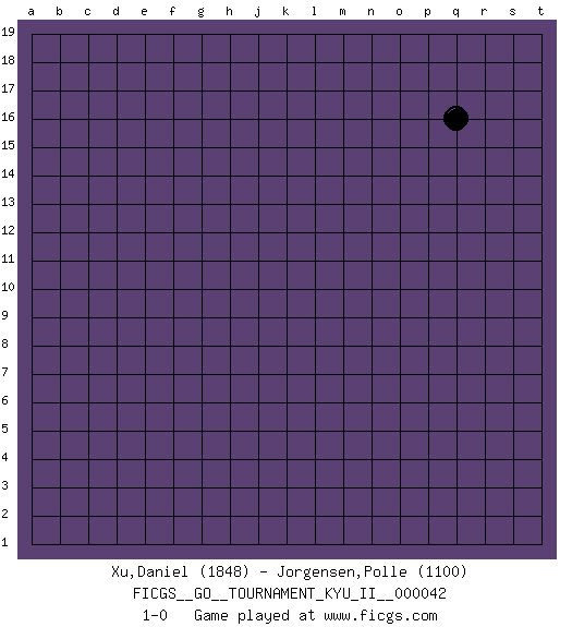 Last move : 1-0 2012 April 23 12:7:5 [Event "FICGS__GO__TOURNAMENT_KYU_II__000042"] [Site "FICGS"] [Date "2012.03.23"] [Round "1"] [Black "Xu,Daniel"] [White "Jorgensen,Polle"] [Result "1-0"] [Rating 1 "1848"] [Rating 2 "1100"] 1.q16 1-0 This go game has been lost on time (started : 2012.03.23 11:55:50) Here are the names of the openings (joseki) played in the four corners : Player Black won this Go (weiqi, baduk) game. Follow this game move after move (download)Those who are good at winning, don't usually fight. (Zhang) To send light into the darkness of men's hearts - such is the duty of the artist. (Schumann)