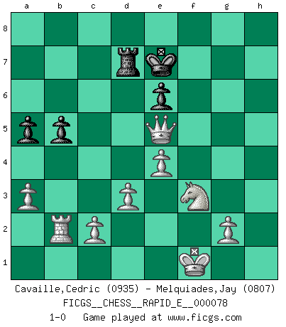 Last move : 1-0 2012 April 30 17:28:41 [Event "FICGS__CHESS__RAPID_E__000078"] [Site "FICGS"] [Date "2012.03.23"] [Round "1"] [White "Cavaille,Cedric"] [Black "Melquiades,Jay"] [Result "1-0"] [WhiteElo "0935"] [BlackElo "0807"] 1.e4 e5 2.Nf3 d6 3.Bc4 Be6 4.Bxe6 fxe6 5.d3 h6 6.Be3 c5 7.Nc3 a6 8.a3 Nd7 9.b4 d5 10.bxc5 d4 11.Nxd4 Nxc5 12.Nf3 Qa5 13.Qd2 Rc8 14.O-O Rd8 15.Bxc5 Bxc5 16.Nxe5 Bxf2+ 17.Qxf2 Nf6 18.Qg3 g5 19.Rxf6 Qxc3 20.Ra2 Qd4+ 21.Kf1 Rf8 22.Rxf8+ Kxf8 23.Nf3 Qc3 24.h4 Qc5 25.hxg5 b5 26.gxh6 Rd7 27.Qg6 a5 28.h7 Qc3 29.Qg8+ Ke7 30.h8Q Qxh8 31.Qxh8 Kd6 32.Qe5+ Ke7 33.Rb2 1-0 Philidor's defense Kingside Castling by player White (move 14) Promotion Queen by player White (move 30) Player White won this chess game. Follow this game move after move (download)Via the squares on the chessboard, the Indians explain the movement of time and the age, the higher influences which control the world and the ties which link Chess with the human soul. (Al-Masudi) Ich hatte Zahnschmerzen im ersten Spiel. In der zweiten Partie tat mir der Kopf weh. In der dritten war es eine Rheuma-Attacke und während der vierten fühlte ich mich nicht gut. Und in der fünften? Nun, man muss doch nicht jedes Spiel gewinnen, oder? (Savielly Grigorievitsch Tartakower) Debes de llevar a tu oponente hacia un profundo y obscuro bosque donde 2+2=5, y el camino que conduce a la salida es suficientemente ancho para solamente uno. (Mikhail Tal) Le génie consiste à savoir transgresser les règles au moment opportun. (Teichmann) Lottery : A tax on people who are bad at math. (Author unknown)