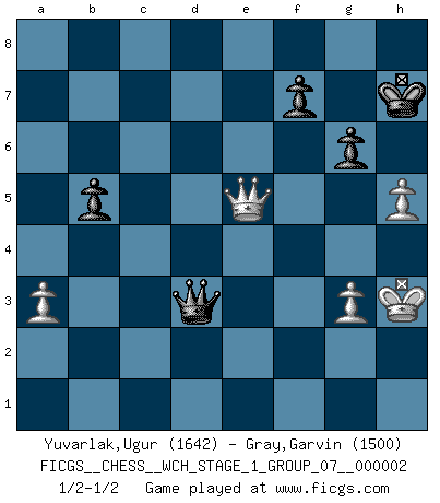 Last move : 1/2-1/2 2007 March 18 12:7:11 [Event "FICGS__CHESS__WCH_STAGE_1_GROUP_07__000002"] [Site "FICGS"] [Date "2007.01.16"] [Round "1"] [White "Yuvarlak,Ugur"] [Black "Gray,Garvin"] [Result "1/2-1/2"] [WhiteElo "1642"] [BlackElo "1500"] 1.d4 Nf6 2.Nf3 g6 3.g3 Bg7 4.Bg2 O-O 5.c4 d6 6.Nc3 c5 7.e4 cxd4 8.Nxd4 Nc6 9.O-O Nxe4 10.Nxc6 Nxc3 11.Nxe7 Qxe7 12.bxc3 Bxc3 13.Rb1 Rb8 14.Rb3 Be5 15.f4 Bf6 16.Ba3 Rd8 17.Bd5 b6 18.Re1 Qd7 19.f5 Bb7 20.fxg6 hxg6 21.Rf1 Bxd5 22.Qxd5 Be5 23.Rbf3 Rf8 24.Rf6 Bxf6 25.Rxf6 Qg4 26.Bxd6 Rbd8 27.Kf2 Rxd6 28.Rxd6 Re8 29.Qd3 Qg5 30.h4 Qc5+ 31.Kf3 Re3+ 32.Qxe3 Qxd6 33.a3 Qc6+ 34.Qe4 Qf6+ 35.Kg4 Qc3 36.Qa8+ Kg7 37.Qxa7 Qxc4+ 38.Kh3 Qf1+ 39.Kh2 Qf2+ 40.Kh3 Qf5+ 41.Kh2 Qc5 42.Qd7 Qf2+ 43.Kh3 Qf1+ 44.Kh2 b5 45.Qd5 Kh7 46.Qe5 Qc4 47.Kh3 Qd3 48.h5 1/2-1/2 King's Indian : Fianchetto without c4 Kingside Castling by player Black (move 4) Kingside Castling by player White (move 9) 10 pieces endgame at move 37 : White KQPPP , Black KQPPP WHITE : King + 1 Queen 3 Pawns BLACK : King + 1 Queen 3 Pawns This chess game ended in a draw. Follow this game move after move (download)Chess is a fairy tale of 1001 blunders. (Savielly Tartakower) Im Reiche der Wirklichkeit ist man nie so glücklich wie im Reiche der Gedanken. (Arthur Schopenhauer) La enorme capacidad mental, en la que sin ella no puede un jugador de Ajedrez existir, es demasiado requerida por el Ajedrez al grado de que nunca podrá liberar su mente de este juego. (Albert Einstein) La conception d'un plan est le processus par lequel un joueur exploite les avantages de sa position tout en s'efforçant d'en réduire au minimum les inconvénients. Afin de garantir le succès, un plan doit toujours se fonder sur un diagnostic objectif des particularités d'une position. La conception d'un plan est d'autant plus difficile que la position est équilibrée, et grandement facilitée lorsqu'il n'existe qu'un seul plan susceptible de répondre aux exigences de la position. (Harry Golombek) Man is still the most extraordinary computer of all. (John F. Kennedy)