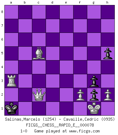 Last move : 1-0 2012 May 10 18:24:39 [Event "FICGS__CHESS__RAPID_E__000078"] [Site "FICGS"] [Date "2012.03.23"] [Round "1"] [White "Salinas,Marcelo"] [Black "Cavaille,Cedric"] [Result "1-0"] [WhiteElo "1254"] [BlackElo "0935"] 1.Nf3 g6 2.Ng5 h6 3.Ne4 Bg7 4.e3 Nf6 5.Qf3 Nxe4 6.Qxe4 d6 7.Bb5+ Bd7 8.Qxb7 Bxb5 9.Qxa8 Nc6 10.Qxd8 Nxd8 11.Nc3 a6 12.Nd5 c6 13.Nc7+ Kd7 14.Nxb5 axb5 15.a4 bxa4 16.Rxa4 Ne6 17.Ra7+ Nc7 18.O-O Ra8 19.Ra3 Rxa3 20.bxa3 e5 21.Bb2 Ke6 22.d4 exd4 23.exd4 c5 24.d5+ Nxd5 25.Bxg7 h5 26.Re1+ Kd7 27.Rb1 f5 28.a4 Kc6 29.a5 Nb4 30.c3 Na6 31.Rb6+ Kd5 32.Rxa6 g5 33.Bf8 Kc4 34.Bxd6 Kxc3 35.Bxc5 f4 36.Re6 Kc4 37.Re5 g4 38.a6 f3 39.a7 fxg2 40.a8Q g3 41.Qa4+ Kd3 42.Re3+ Kd2 43.Qa2 Kd1 44.Qe2 Kc1 45.Rc3+ Kb1 46.Qc2+ Ka1 47.Ra3+ 1-0 Reti Opening Kingside Castling by player White (move 18) 10 pieces endgame at move 39 : White KRBPPP , Black KPPP WHITE : King + 1 Rook 1 Bishop 3 Pawns BLACK : King + 3 Pawns Promotion Queen by player White (move 40) Player White won this chess game. Follow this game move after move (download)Discovered check is the dive bomber of the Chessboard. (Reuben Fine) Wenn Spassky eine Figur opfert kannst du genauso gut aufgeben. Aber wenn Tal eine Figur opfert, spiel weiter. Er könnte noch eine weitere opfern, und dann ... wer weiß? (Miguel Najdorf) Bendita sea la memoria de aquel que dio al mundo este juego inmortal. (A. G. Gardiner) Même un GMI sait rarement calculer sur plus de cinq coups une attaque à sacrifices. (Rudolf Spielmann) Crush them ! Make them suffer ! (General Grievous in Star Wars ep.3)