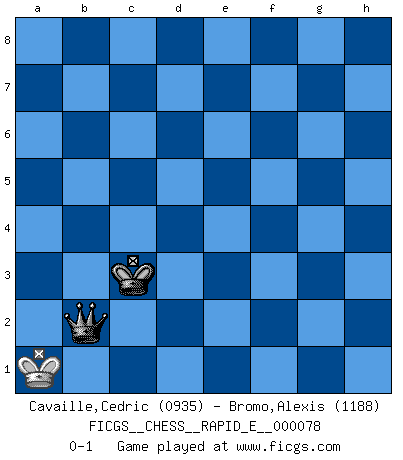 Last move : 0-1 2012 March 28 21:12:50 [Event "FICGS__CHESS__RAPID_E__000078"] [Site "FICGS"] [Date "2012.03.23"] [Round "1"] [White "Cavaille,Cedric"] [Black "Bromo,Alexis"] [Result "0-1"] [WhiteElo "0935"] [BlackElo "1188"] 1.e4 e5 2.Nf3 Nc6 3.Bc4 h6 4.a3 Nf6 5.Nc3 a6 6.b4 b5 7.Bb3 Bb7 8.d4 d6 9.dxe5 Nxe5 10.Nxe5 dxe5 11.Qxd8+ Rxd8 12.O-O Nxe4 13.Nxe4 Bxe4 14.c4 c5 15.cxb5 axb5 16.bxc5 Bxc5 17.Be3 Bxe3 18.fxe3 O-O 19.a4 Rd3 20.Bc2 Rxe3 21.Bxe4 Rxe4 22.axb5 Rb8 23.Rab1 Kf8 24.Kf2 Rf4+ 25.Ke2 Rxf1 26.Kxf1 Ke7 27.Ke2 Kd6 28.Ke3 Kd5 29.b6 Rb7 30.g4 g6 31.h4 f6 32.h5 g5 33.Rb5+ Kc6 34.Rb1 Rxb6 35.Rxb6+ Kxb6 36.Ke4 Kc5 37.Kf5 Kd5 38.Kxf6 e4 39.Kg6 e3 40.Kxh6 e2 41.Kxg5 e1Q 42.h6 Qe5+ 43.Kg6 Ke6 44.g5 Qf5+ 45.Kh5 Kf7 46.h7 Qxh7+ 47.Kg4 Kg6 48.Kf4 Qh4+ 49.Ke5 Qxg5+ 50.Ke4 Kf6 51.Kd4 Qe5+ 52.Kd3 Kf5 53.Kc4 Ke4 54.Kb4 Kd4 55.Kb3 Qc5 56.Kb2 Qc3+ 57.Ka2 Kc4 58.Kb1 Qd2 59.Ka1 Kb3 60.Kb1 Kc3 61.Ka1 Qb2+ 0-1 King's pawn game Kingside Castling by player White (move 12) Kingside Castling by player Black (move 18) 10 pieces endgame at move 34 : White KRPP , Black KRPPPP WHITE : King + 1 Rook 2 Pawns BLACK : King + 1 Rook 4 Pawns 9 pieces endgame at move 35 : White KRPP , Black KPPPP WHITE : King + 1 Rook 2 Pawns BLACK : King + 4 Pawns 8 pieces endgame at move 35 : White KPP , Black KPPPP WHITE : King + 2 Pawns BLACK : King + 4 Pawns 7 pieces endgame at move 38 : White KPP , Black KPPP WHITE : King + 2 Pawns BLACK : King + 3 Pawns 6 pieces endgame at move 40 : White KPP , Black KPP WHITE : King + 2 Pawns BLACK : King + 2 Pawns 5 pieces endgame at move 41 : White KPP , Black KP WHITE : King + 2 Pawns BLACK : King + 1 Pawn Promotion Queen by player Black (move 41) 4 pieces endgame at move 46 : White KP , Black KQ WHITE : King + 1 Pawn BLACK : King + 1 Queen 3 pieces endgame at move 49 : White K , Black KQ WHITE : King + BLACK : King + 1 Queen Player Black won this chess game. Follow this game move after move (download)It is the aim of the modern school, not to treat every position according to one general law, but according to the principle inherent in the position. (Richard Reti) Lisa Lane, amerikanische Schachmeisterin, hatte Fischer einmal als stärksten lebenden Spieler bezeichnet. Antwort: Das ist richtig, aber Lisa Lane ist eigentlich nicht in der Lage, das zu beurteilen. (Robert James Fischer) Repentinamente, me resultaba obvio en mi analisis que yo había pasado por alto lo que Fischer había visto en el tablero con la mas grande facilidad. (Mikhail Botvinnik) Un footballeur joue avec ses pieds, parfois avec sa tête. Un joueur d'échecs ne joue qu'avec sa tête. Et quand il ne joue plus, il meurt. (Jacob Murray) Life doesn't imitate art, it imitates bad television. (Woody Allen)