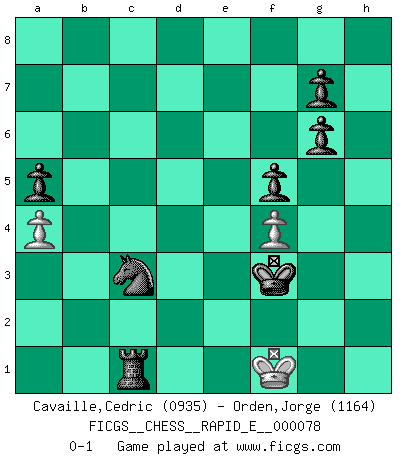 Last move : 0-1 2012 April 19 22:15:31 [Event "FICGS__CHESS__RAPID_E__000078"] [Site "FICGS"] [Date "2012.03.23"] [Round "1"] [White "Cavaille,Cedric"] [Black "Orden,Jorge"] [Result "0-1"] [WhiteElo "0935"] [BlackElo "1164"] 1.e4 c5 2.Nf3 d6 3.Bc4 Nf6 4.Nc3 e6 5.d4 cxd4 6.Qxd4 Nc6 7.Qd1 Be7 8.Nd4 O-O 9.Nxc6 bxc6 10.b4 d5 11.exd5 cxd5 12.Bb3 Qc7 13.Bd2 Bxb4 14.Na4 Bxd2+ 15.Qxd2 Ne4 16.Qe2 a5 17.O-O Bd7 18.f3 Bxa4 19.Bxa4 Nc3 20.Qf2 Nxa4 21.Qd4 Qxc2 22.Qd1 Qxd1 23.Rfxd1 Rfc8 24.Rdc1 d4 25.Rxc8+ Rxc8 26.Rb1 d3 27.Kf1 f5 28.g4 Rc2 29.h4 Nc3 30.Rb8+ Kf7 31.Rb7+ Kf6 32.g5+ Kg6 33.Rb6 d2 34.Rxe6+ Kh5 35.Rd6 d1Q+ 36.Rxd1 Nxd1 37.g6 hxg6 38.Ke1 Nc3 39.a3 Kxh4 40.a4 Kg3 41.f4 Kf3 42.Kf1 Rc1+ 0-1 Sicilian Kingside Castling by player Black (move 8) Kingside Castling by player White (move 17) Promotion Queen by player Black (move 35) 10 pieces endgame at move 39 : White KPP , Black KRNPPPP WHITE : King + 2 Pawns BLACK : King + 1 Rook 1 Knight 4 Pawns Player Black won this chess game. Follow this game move after move (download)If you aren't afraid of Spassky, then I have removed the element of money. (Jim Slater) Im Schach nämlich geht es darum, daß Ich des Gegners klein zu kriegen, sein Ego zu zerbrechen und zu zermahlen, seine Selbstachtung zu zertreten und zu verscharren und seine ganze mißachtenswerte sogenannte Persönlichkeit ein für alle Mal tot zu hacken und zu zerstampfen und dadurch die menschliche Gesellschaft von einer stinkenden Pestbeule zu befreien. Es ist ein königliches Spiel. (Robert James Fischer) Por tratar de evitar la pérdida de una pieza, muchas personas han perdido una partida de Ajedrez. (Savielly Tartakover) Je fais ceci parce que dans cinquante coups j'obtiendrai cela; je m'appelle Mikhail Moisevitch Botvinnik. (Botvinnik) When you've done things right people won't know you've done anything at all. (Futurama)