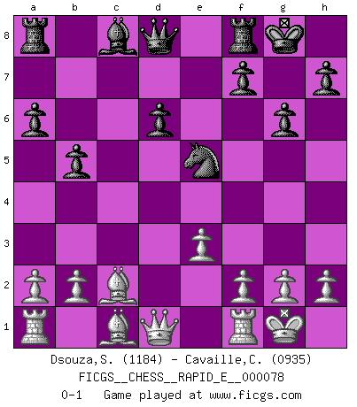 Last move : 0-1 2012 May 8 0:59:6 [Event "FICGS__CHESS__RAPID_E__000078"] [Site "FICGS"] [Date "2012.03.23"] [Round "1"] [White "Dsouza,Stanislaus"] [Black "Cavaille,Cedric"] [Result "0-1"] [WhiteElo "1184"] [BlackElo "0935"] 1.c4 g6 2.d4 d6 3.Nc3 Bg7 4.e3 e5 5.dxe5 Bxe5 6.Bd3 Nf6 7.Nd5 Nxd5 8.cxd5 O-O 9.Nf3 c6 10.dxc6 Nxc6 11.O-O a6 12.Nxe5 Nxe5 13.Bc2 b5 0-1 This chess game has been lost on time (started : 2012.03.23 15:54:11) English Opening Kingside Castling by player Black (move 8) Kingside Castling by player White (move 11) Player Black won this chess game. Follow this game move after move (download)A player surprised is half beaten. (Proverb) Vom Schach wurde gesagt das Leben sei dafür nicht lange genug. Aber das ist der Fehler des Lebens, nicht des Schach'. (Irving Chernev) No es una movida, aún la mejor movida que tu debas buscar, sino un plan comprensible. (Eugene Znosko-Borovsky) La menace est plus forte que l'exécution. (Aaron Nimzovitch) I have opinions of my own - strong opinions - but I don't always agree with them. (George Bush)