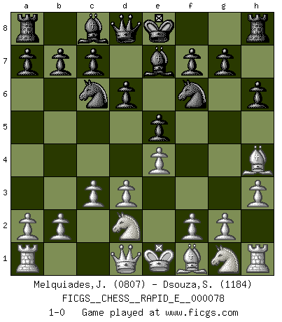 Last move : 1-0 2012 May 17 1:19:56 [Event "FICGS__CHESS__RAPID_E__000078"] [Site "FICGS"] [Date "2012.03.23"] [Round "1"] [White "Melquiades,Jay"] [Black "Dsouza,Stanislaus"] [Result "1-0"] [WhiteElo "0807"] [BlackElo "1184"] 1.e4 e5 2.d3 Nc6 3.c3 Nf6 4.Bg5 h6 5.Bh4 Be7 6.h3 d6 7.Nd2 1-0 This chess game has been lost on time (started : 2012.03.23 15:54:11) Variation Indian Opening : Indian Opening Player White won this chess game. Follow this game move after move (download)It is peculiar but a fact nevertheless, that gamblers in chess always have enthusiastic followers. (Botvinnik) Offensichtlich kennt Kasparow nichts anderes als Schach, und ich könnte 500 weitere Spieler dieser Sorte benennen. (Judith Polgar) Un Peón pasado es un criminal, quién debe ser mantenido bajo candado y llave. Leves medidas, tales como vigilancia policiaca, no son suficientes. (Aaron Nimzovich) Mon pion favori sur ma case favorite ! Bronstein en parlant d'un coup de pion en h5 quand il avait les Noirs. Perseverance does not equal worthiness. Next time you want to get my attention, wear something fun. Low-riding jeans are hot. (Gregory House, House M.D.)