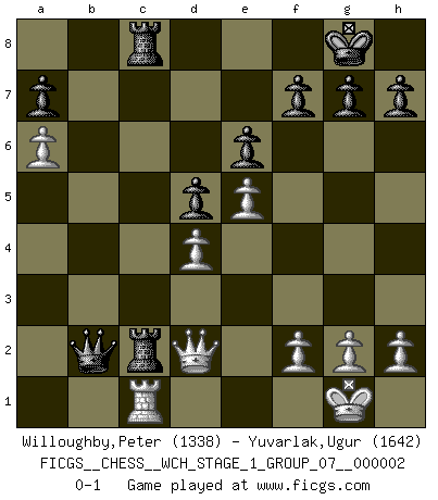 Last move : 0-1 2007 February 3 11:37:19 [Event "FICGS__CHESS__WCH_STAGE_1_GROUP_07__000002"] [Site "FICGS"] [Date "2007.01.16"] [Round "1"] [White "Willoughby,Peter"] [Black "Yuvarlak,Ugur"] [Result "0-1"] [WhiteElo "1338"] [BlackElo "1642"] 1.e4 c5 2.Nf3 d6 3.Bb5+ Bd7 4.Bxd7+ Qxd7 5.O-O Nc6 6.c3 Nf6 7.Re1 e6 8.d4 cxd4 9.cxd4 d5 10.e5 Ne4 11.Nc3 Nxc3 12.bxc3 Rc8 13.a4 Na5 14.Bb2 Nc4 15.Ra2 Be7 16.Nd2 O-O 17.Nxc4 Rxc4 18.a5 Rfc8 19.a6 b5 20.Ra5 b4 21.cxb4 Bxb4 22.Ra1 Bxe1 23.Qxe1 Qb5 24.Qd2 Rc2 25.Rc1 Qxb2 0-1 Sicilian : Canal-Sokolsky attack, 3...Bd7 Kingside Castling by player White (move 5) Kingside Castling by player Black (move 16) Player Black won this chess game. Follow this game move after move (download)Chess is the gymnasium of the mind. (Blaise Pascal) Das typische an einem Großmeister ist, daß er eine gewonnene Position schnell und schmerzlos gewinnt. (Irving Chernev) No es una movida, aún la mejor movida que tu debas buscar, sino un plan comprensible. (Eugene Znosko-Borovsky) Il s'avisa de me proposer d'apprendre les échecs qu'il jouait un peu... me voilà forcené des échecs. J'achète un échiquier, je m'enferme dans ma chambre, j'y passe des jours et des nuits à vouloir apprendre par cœur toutes les parties. (Jean-Jacques Rousseau, Confessions) Empty your mind, be formless, shapeless — like water. (Bruce Lee)