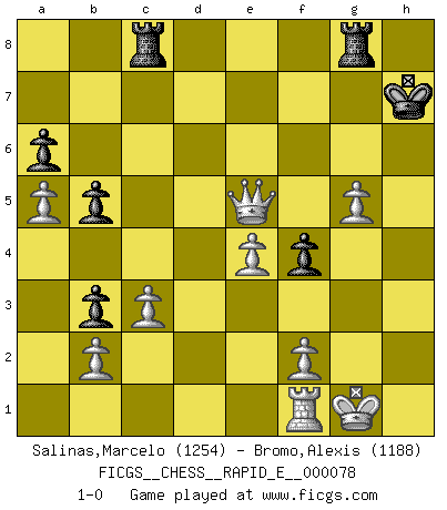 Last move : 1-0 2012 May 22 20:28:56 [Event "FICGS__CHESS__RAPID_E__000078"] [Site "FICGS"] [Date "2012.03.23"] [Round "1"] [White "Salinas,Marcelo"] [Black "Bromo,Alexis"] [Result "1-0"] [WhiteElo "1254"] [BlackElo "1188"] 1.e4 e5 2.Qh5 Nc6 3.Bc4 g6 4.Qf3 Nf6 5.Nh3 Bc5 6.Ng5 O-O 7.Qb3 Qe7 8.O-O a6 9.a4 d6 10.a5 Nd4 11.Qd3 b5 12.Bb3 Bb7 13.Nc3 Ng4 14.Nf3 Qf6 15.Nxd4 Bxd4 16.Qg3 h5 17.Nd5 Bxd5 18.Bxd5 Rac8 19.Ra3 c6 20.Rf3 Qe7 21.Bb3 Ba7 22.d3 Kg7 23.Be3 c5 24.c3 c4 25.Bxa7 cxb3 26.d4 exd4 27.Bxd4 Ne5 28.h4 f6 29.Bxe5 dxe5 30.Rd3 f5 31.Qh3 f4 32.Rd7 Qxd7 33.Qxd7+ Kh6 34.g4 hxg4 35.Qxg4 Rg8 36.Qg5+ Kh7 37.Qxe5 g5 38.hxg5 1-0 Variation Patzer Opening : Patzer Opening Kingside Castling by player Black (move 6) Kingside Castling by player White (move 8) Player White won this chess game. Follow this game move after move (download)Fischer Chess play was always razor-sharp, rational and brilliant. One of the best ever. (Dave Regis) Wenn du gegen Bobby spielst, ist es keine Frage von gewinnen oder verlieren. Es ist eine Frage des Überlebens. (Boris Vassilievich Spassky) Nos gusta pensar. (Gary Kasparov) L'attaque fait le spectacle, la défense gagne les matchs. (Dicton footballistique) No man has ever achieved immortality in his own life time. (Unknown)