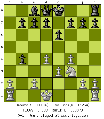 Last move : 0-1 2012 May 18 13:22:37 [Event "FICGS__CHESS__RAPID_E__000078"] [Site "FICGS"] [Date "2012.03.23"] [Round "1"] [White "Dsouza,Stanislaus"] [Black "Salinas,Marcelo"] [Result "0-1"] [WhiteElo "1184"] [BlackElo "1254"] 1.f4 Nf6 2.Nf3 a5 3.d4 Ra6 4.Nc3 e6 5.e3 Bb4 6.Bxa6 Bxc3+ 7.Ke2 Nxa6 8.bxc3 Ne4 9.Ba3 Nxc3+ 10.Ke1 Nxd1 11.Kxd1 Nb4 12.Bxb4 axb4 0-1 Bird's Opening Player Black won this chess game. Follow this game move after move (download)Chess problems demand from the composer the same virtues that characterize all worthwhile art: originality, invention, conciseness, harmony, complexity, and splendid insincerity. (Vladimir Nabokov) Fallen sollten polizeilich verboten werden. (Savielly Grigorievitsch Tartakower) El Ajedrez, como cualquier otra actividad creativa, puede existir solo a través de méritos combinados de aquellos que tienen talento creativo y de aquellos que tienen la habilidad de organizar un trabajo creativo. (Mikhail Botvinnik) Le thème de l'attaque double intervient d'une manière ou d'une autre dans l'immense majorité des combinaisons. (Youri Averbakh) Imagination is more important than knowledge. Knowledge is limited. Imagination encircles the world. (Albert Einstein)