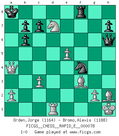Last move : 1-0 2012 April 4 19:51:10 [Event "FICGS__CHESS__RAPID_E__000078"] [Site "FICGS"] [Date "2012.03.23"] [Round "1"] [White "Orden,Jorge"] [Black "Bromo,Alexis"] [Result "1-0"] [WhiteElo "1164"] [BlackElo "1188"] 1.e4 e5 2.Nf3 Nc6 3.c3 Nf6 4.Qc2 d5 5.d3 Bg4 6.Be2 Bc5 7.h3 Bh5 8.b4 Bb6 9.b5 Na5 10.Nxe5 dxe4 11.Bxh5 g6 12.Be2 Qe7 13.Bf4 O-O-O 14.dxe4 Qc5 15.O-O Nh5 16.Bh2 Rhf8 17.Nd3 Qxb5 18.Nb4 Qg5 19.Nd5 Nc6 20.Nxb6+ axb6 21.f4 Qc5+ 22.Kh1 f5 23.e5 g5 24.Bxh5 g4 25.hxg4 fxg4 26.Bxg4+ Kb8 27.Nd2 Ne7 28.Ne4 Qc6 29.Bf3 Qh6 30.Nf6 Ng6 31.Rad1 Rxd1 32.Rxd1 Nxf4 33.Nd7+ Ka8 34.Qa4+ 1-0 Ponziani : Jaenisch counter-attack Queenside Castling by player Black (move 13) Kingside Castling by player White (move 15) Player White won this chess game. Follow this game move after move (download)If a ruler does not understand Chess, how can he rule over a kingdom ? (King Khusros II) Pläne sind die Träume des Verständigen. (Ernst Freiherr von Feuchtersleben) Yo tuve un dolor de muelas en la primer partida. En el segundo juego, tuve un dolor de cabeza. En el tercero, tuve un ataque de reumatísmo. En la cuarta partida, no me sentía muy bien. ¿Y en el quinto juego? Bueno, ¿que acaso uno tiene que ganar todos los juegos?. (Siegbert Tarrasch) Les échecs c'est le défi de l'alpiniste, toujours plus haut, prêt à tout pour monter à l'assaut du Roi ennemi. Les échecs, c'est de la musique en mouvement, un ballet majestueux pour les yeux. C'est de la poésie composée par les fantômes du passé qui au même titre que Rimbaud ou Verlaine méritent notre admiration. Les échecs, c'est de la peinture ou le moindre mouvement modifie le tableau pour en faire un Picasso ou un Van Gogh. Les échecs, c'est tout et rien, c'est la vie et la mort. Jjulie33 sur le forum de France-Echecs. Computer Science is no more about computers than astronomy is about telescopes. (Edsger W. Dijkstra)