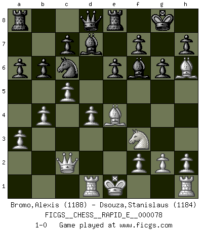 Last move : 1-0 2012 May 11 0:58:13 [Event "FICGS__CHESS__RAPID_E__000078"] [Site "FICGS"] [Date "2012.03.23"] [Round "1"] [White "Bromo,Alexis"] [Black "Dsouza,Stanislaus"] [Result "1-0"] [WhiteElo "1188"] [BlackElo "1184"] 1.d4 d5 2.c4 e6 3.Nc3 Bd7 4.Nf3 Bb4 5.Bd2 Nf6 6.a3 Be7 7.Qc2 Nc6 8.c5 O-O 9.b4 a6 10.e3 Re8 11.Bd3 b6 12.e4 dxe4 13.Nxe4 Nxe4 14.Bxe4 g6 15.Bh6 Bf6 16.Rd1 1-0 This chess game has been lost on time (started : 2012.03.23 15:54:11) QGD : 3.Nc3 Kingside Castling by player Black (move 8) Player White won this chess game. Follow this game move after move (download)Castle early and often. (Rob Sillars) Je mehr wir mit Computern analysieren, desto mehr glauben wir an Verteidigung. (Vladimir Kramnik) Un entendimiento minucioso de las típicas continuaciones de mate hacen de las mas complicadas combinaciones de sacrificio que conducen hacia ellas no solo no dificiles, sino casi un asunto de rutina. (Siegbert Tarrasch) Les Echecs sont affaire de jugement sensible. Savoir quand frapper et quand esquiver. (Fischer) Inventor: A person who makes an ingenious arrangement of wheels, levers and springs, and believes it civilization. (Ambrose Bierce, The Devil's Dictionary)