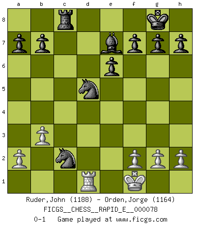 Last move : 0-1 2012 May 28 14:30:40 [Event "FICGS__CHESS__RAPID_E__000078"] [Site "FICGS"] [Date "2012.03.23"] [Round "1"] [White "Ruder,John"] [Black "Orden,Jorge"] [Result "0-1"] [WhiteElo "1188"] [BlackElo "1164"] 1.e4 c5 2.Bc4 d6 3.Nf3 Nf6 4.O-O e6 5.Nc3 Be7 6.Re1 O-O 7.e5 dxe5 8.Nxe5 Nbd7 9.d4 cxd4 10.Qxd4 Nxe5 11.Qxd8 Rxd8 12.Rd1 Nxc4 13.Bf4 Nd5 14.Bc7 Nxc7 15.Rxd8+ Bxd8 16.Rd1 Bf6 17.Ne4 Be7 18.b3 Na3 19.Nd6 Nxc2 20.Nxc8 Rxc8 21.Kf1 Nd5 0-1 This chess game has been lost on time (started : 2012.03.23 15:54:11) Sicilian defense Kingside Castling by player White (move 4) Kingside Castling by player Black (move 6) Player Black won this chess game. Follow this game move after move (download)Chess, like love, like music, has the power to make people happy. (Siegbert Tarrasch) Als ich elf wurde, wurde ich einfach gut. (Robert James Fischer) Ciertamente el estado mental actual de Bobby Fischer es una tragedia. Uno de los mas grandes jugadores de Ajedrez del mundo -el orgullo y pena del Ajedrez Americano. (Frank Brady) Les échecs, c'est la lutte contre l'erreur. (Johannes Zukertort) I believe in luck. How else can you explain the success of those you dislike ? (Jean Cocteau)