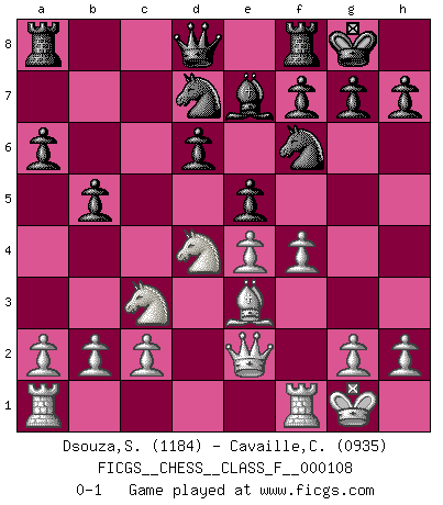 Last move : 0-1 2012 August 15 13:22:43 [Event "FICGS__CHESS__CLASS_F__000108"] [Site "FICGS"] [Date "2012.03.24"] [Round "1"] [White "Dsouza,Stanislaus"] [Black "Cavaille,Cedric"] [Result "0-1"] [WhiteElo "1184"] [BlackElo "0935"] 1.e4 c5 2.Nf3 d6 3.Bb5+ Bd7 4.Bxd7+ Nxd7 5.d3 Ngf6 6.Be3 e6 7.O-O Be7 8.Nc3 O-O 9.d4 cxd4 10.Nxd4 a6 11.f4 b5 12.Qe2 e5 0-1 This chess game has been lost on time (started : 2012.03.24 3:53:26) Sicilian : Canal-Sokolsky attack, 3...Bd7 Kingside Castling by player White (move 7) Kingside Castling by player Black (move 8) Player Black won this chess game. Follow this game move after move (download)I believe that Chess possesses a magic that is also a help in advanced age. A rheumatic knee is forgotten during a game of Chess and other events can seem quite unimportant in comparison with a catastrophe on the chessboard. (Vlastimil Hort) Bis zum Jahr 1971 verlief in meiner Schachkariere alles glatt. Dieses dramatische Match [Fischer-Taimanov 6:0] machte mein Leben zur Hölle. (Mark Taimanov) Fischer era un maestro de claridad y un Rey del posicionamiento astuto. Sus oponentes podían ver hacia donde se dirigía pero eran impotentes para detenerlo. (Bruce Pandolfini) La vérité est comme le meilleur coup aux échecs : elle existe, mais il faut la chercher. (Arturo Perez-Reverte) Nothing is more important for teaching us to understand the concepts we have than constructing fictitious ones. (Ludwig Wittgenstein)