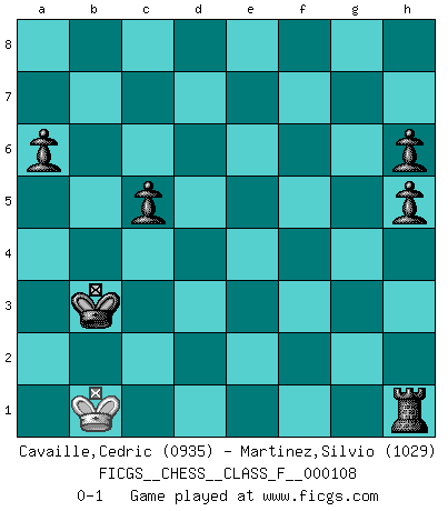 Last move : 0-1 2012 August 25 15:6:52 [Event "FICGS__CHESS__CLASS_F__000108"] [Site "FICGS"] [Date "2012.03.24"] [Round "1"] [White "Cavaille,Cedric"] [Black "Martinez,Silvio"] [Result "0-1"] [WhiteElo "0935"] [BlackElo "1029"] 1.e4 e5 2.Nf3 Nc6 3.Bc4 Nh6 4.d4 a6 5.dxe5 Bc5 6.Ng5 O-O 7.Nf3 d5 8.exd5 Na5 9.b3 Ng4 10.h3 Nxf2 11.Qd2 Nxh1 12.Qf4 Nxc4 13.bxc4 h6 14.Be3 Bxe3 15.Qxe3 Ng3 16.e6 fxe6 17.dxe6 Nf5 18.Qe2 Re8 19.Qd2 Rxe6+ 20.Kf1 Qxd2 21.Nbxd2 Ne3+ 22.Kf2 Nxc2 23.Rc1 Ne3 24.Re1 Bd7 25.Rxe3 Rf6 26.Ne4 Rf7 27.Nc5 Bc6 28.Ne6 Bxf3 29.gxf3 Re8 30.Nxc7 Rxe3 31.Kxe3 Rxc7 32.Kd4 Kf7 33.c5 Ke6 34.f4 Rd7+ 35.Ke4 Rd5 36.c6 bxc6 37.a3 g6 38.h4 Ra5 39.h5 gxh5 40.f5+ Rxf5 41.a4 Ra5 42.Kd4 c5 43.Kc4 Kd6 44.Kc3 Rxa4 45.Kb3 Rh4 46.Kc3 Kd5 47.Kd3 Rh3+ 48.Ke2 Ke4 49.Kf2 Kf4 50.Kg2 Ra3 51.Kf2 Ra2+ 52.Ke1 Ke3 53.Kd1 Kd3 54.Kc1 Rh2 55.Kb1 Kc3 56.Ka1 Kb3 57.Kb1 Rh1+ 0-1 King's pawn game Kingside Castling by player Black (move 6) 10 pieces endgame at move 36 : White KPPP , Black KRPPPP WHITE : King + 3 Pawns BLACK : King + 1 Rook 4 Pawns 9 pieces endgame at move 39 : White KPP , Black KRPPPP WHITE : King + 2 Pawns BLACK : King + 1 Rook 4 Pawns 8 pieces endgame at move 40 : White KP , Black KRPPPP WHITE : King + 1 Pawn BLACK : King + 1 Rook 4 Pawns 7 pieces endgame at move 44 : White K , Black KRPPPP WHITE : King + BLACK : King + 1 Rook 4 Pawns Player Black won this chess game. Follow this game move after move (download)Chess is everything: art, science and sport. (Anatoly Karpov) Korrekt heißt in Deutschland die Haltung eines Mannes, dessen Benehmen nach dem Urteile seiner Nachbarn seiner Stellung angemessen ist. Um korrekt zu sein, muß man sich der Meinung der anderen anpassen... (Emanuel Lasker) Cuando no sepas que mover, espera por una idea que se le venga a la la cabeza de tu oponente. Tenlo por seguro de que esa idea estará incorrecta. (Siegbert Tarrasch) La menace est plus forte que l'exécution. (Aaron Nimzovitch) Mandala - that's it! 16x16 squares as multiple of the four and the eight because of the Four Noble Truths and the Noble Eightfold Path. (Heinz-Georg Lehnhoff about Big Chess)