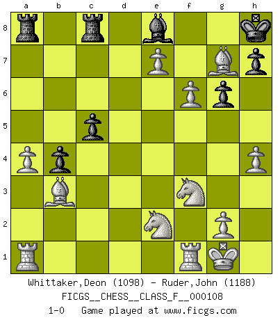 Last move : 1-0 2012 September 16 21:44:38 [Event "FICGS__CHESS__CLASS_F__000108"] [Site "FICGS"] [Date "2012.03.24"] [Round "1"] [White "Whittaker,Deon"] [Black "Ruder,John"] [Result "1-0"] [WhiteElo "1098"] [BlackElo "1188"] 1.e4 e5 2.f4 exf4 3.Nf3 Bc5 4.Bc4 Nf6 5.d4 Be7 6.Nc3 O-O 7.e5 Ng4 8.Ne2 d5 9.Bd3 Nc6 10.Bxf4 a5 11.h3 Ne3 12.Bxe3 a4 13.a3 g6 14.h4 Bg4 15.c4 dxc4 16.Bxc4 Na5 17.Qxa4 Qd7 18.Qxd7 Bxd7 19.b3 b5 20.Bh6 Nxb3 21.Bxb3 b4 22.a4 Rfb8 23.O-O c5 24.d5 f6 25.d6 Kh8 26.dxe7 Rc8 27.exf6 Be8 28.Bg7+ 1-0 King's knight's gambit Kingside Castling by player Black (move 6) Kingside Castling by player White (move 23) Player White won this chess game. Follow this game move after move (download)Though most people love to look at the games of the great attacking masters, some of the most successful players in history have been the quiet positional players. They slowly grind you down by taking away your space, tying up your pieces, and leaving you with virtually nothing to do ! (Yasser Seirawan) Es genügt nicht ein guter Spieler zu sein, man muß auch gut spielen. (Siegbert Tarrasch) El Ajedrez es un invernadero donde los frutos del carácter pueden madurar mas completamente que en la vida. (Edward Morgan Foster) Aux échecs, l'amour-propre est satisfait quand on remporte la victoire, mais il n'y a pas de honte à être battu. (Benjamin Franklin) There is far too much law for those who can afford it and far too little for those who cannot. (Derek Bok)