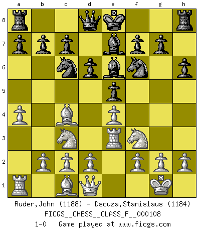 Last move : 1-0 2012 May 24 14:5:45 [Event "FICGS__CHESS__CLASS_F__000108"] [Site "FICGS"] [Date "2012.03.24"] [Round "1"] [White "Ruder,John"] [Black "Dsouza,Stanislaus"] [Result "1-0"] [WhiteElo "1188"] [BlackElo "1184"] 1.e4 e5 2.Nf3 Nc6 3.Bc4 h6 4.O-O d6 5.Re1 Nf6 6.Nc3 Be7 7.Re3 Be6 8.a4 1-0 This chess game has been lost on time (started : 2012.03.24 3:53:26) King's pawn game Kingside Castling by player White (move 4) Player White won this chess game. Follow this game move after move (download)Help your pieces so they can help you. (Paul Morphy) Wer nie einen Fehler gemacht hat, hat nie etwas Neues ausprobiert. (Albert Einstein) En partidas rápidas, el Caballo es mas poderoso que el Alfil. (Vlastimil Hort) Horreur, mais aussi harmonie suprême : qu'y avait-il en effet au monde en dehors des échecs ? Le brouillard, l'inconnu, le non-être... (Vladimir Nabokov) Rules and bones are meant to be broken. (Anonymous)