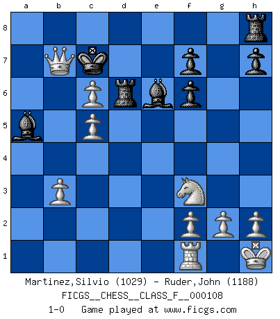 Last move : 1-0 2012 October 6 21:32:50 [Event "FICGS__CHESS__CLASS_F__000108"] [Site "FICGS"] [Date "2012.03.24"] [Round "1"] [White "Martinez,Silvio"] [Black "Ruder,John"] [Result "1-0"] [WhiteElo "1029"] [BlackElo "1188"] 1.e4 e5 2.Nf3 d6 3.Nc3 Be6 4.d4 Nc6 5.d5 Bd7 6.dxc6 Bxc6 7.Bb5 Nf6 8.Nd5 Bxb5 9.a4 Bc4 10.Nxf6+ Qxf6 11.b3 Be6 12.O-O O-O-O 13.Bb2 d5 14.exd5 Rxd5 15.Qe2 Bc5 16.c4 Rd6 17.Kh1 b5 18.axb5 c6 19.Bxe5 Rd7 20.Bxf6 gxf6 21.bxc6 Rd6 22.Rxa7 Kb8 23.Ra5 Bb6 24.c5 Bxa5 25.Qb5+ Kc7 26.Qb7 1-0 Philidor's defense Kingside Castling by player White (move 12) Queenside Castling by player Black (move 12) Player White won this chess game. Follow this game move after move (download)My style is somewhere between that of Tal and Petrosian. (Reshevsky) Karpov ist ein Museumsstück. (Garry Kasparov) El hombre es un frívolo, una creatura engañosa y como un jugador de Ajedrez, se preocupa mas por el proceso de obtener su meta que de la meta por sí misma. (Dostoyevsky) Mon pion favori sur ma case favorite ! Bronstein en parlant d'un coup de pion en h5 quand il avait les Noirs. You can think I'm wrong, but that's no reason to quit thinking. (Gregory House, House M.D.)