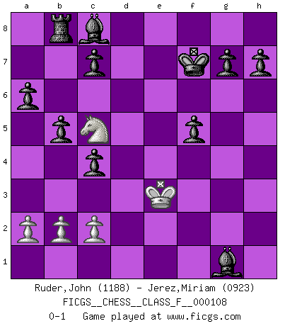 Last move : 0-1 2012 October 8 17:27:16 [Event "FICGS__CHESS__CLASS_F__000108"] [Site "FICGS"] [Date "2012.03.24"] [Round "1"] [White "Ruder,John"] [Black "Jerez,Miriam"] [Result "0-1"] [WhiteElo "1188"] [BlackElo "0923"] 1.e4 e5 2.Nf3 Nc6 3.Bc4 Nh6 4.O-O Bc5 5.d4 exd4 6.Re1 O-O 7.e5 Re8 8.Bg5 Be7 9.Nxd4 Bxg5 10.Re4 Nxe5 11.Qe1 d5 12.Rxe5 Rxe5 13.Qxe5 dxc4 14.Nc3 a6 15.Re1 b6 16.Ne4 f6 17.Qg3 b5 18.f4 Qxd4+ 19.Qf2 Qxf2+ 20.Kxf2 Bxf4 21.Nc5 Rb8 22.Re8+ Kf7 23.Re4 Bxh2 24.g4 Nxg4+ 25.Kf3 f5 26.Re3 Nxe3 27.Kxe3 Bg1+ 0-1 King's pawn game Kingside Castling by player White (move 4) Kingside Castling by player Black (move 6) Player Black won this chess game. Follow this game move after move (download)War is the child of passion, passion is the child of narcissism and narcissism is the child. (...) Another game ? (Thibault de Vassal) Die Elozahlen sind sehr schlecht für das Schach. Jetzt ist Schach eine Sportindustrie, die darauf zielt Elopunkte zu machen. (Miguel Najdorf) En la perfecta combinación de Ajedrez como en una historia corta de primera clase, toda la trama y contra trama deberá conducir hacia un final sorprendente, el interes no es mitigado hasta el último momento. (Yates and Winter) Pour se monter efficace, un Cavalier a besoin d'avant-postes ! Les Cavaliers font les meilleurs bloqueurs de pions passés. Hold em is to stud what chess is to checkers. (Johnny Moss)