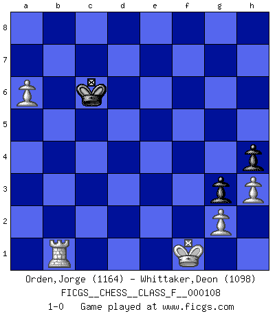Last move : 1-0 2012 May 15 0:39:2 [Event "FICGS__CHESS__CLASS_F__000108"] [Site "FICGS"] [Date "2012.03.24"] [Round "1"] [White "Orden,Jorge"] [Black "Whittaker,Deon"] [Result "1-0"] [WhiteElo "1164"] [BlackElo "1098"] 1.e4 e5 2.Nf3 Nc6 3.c3 d5 4.Qc2 f5 5.exd5 Qxd5 6.Be2 Be7 7.c4 Nb4 8.Qb3 Qc5 9.a3 Nc6 10.Nc3 Be6 11.Qxb7 Rc8 12.Qb5 Qxb5 13.Nxb5 g5 14.d3 g4 15.Nd2 h5 16.b4 Nf6 17.O-O O-O 18.Bb2 h4 19.Nc3 a6 20.f3 a5 21.Nb3 Ra8 22.bxa5 Rfb8 23.Nb5 Rc8 24.fxg4 fxg4 25.a4 e4 26.Bxf6 Bd6 27.Nxd6 cxd6 28.Nd4 Nxd4 29.Bxd4 Rxa5 30.Rfb1 Rca8 31.Rb4 Bd7 32.dxe4 g3 33.h3 Kf7 34.Bf3 Ke6 35.Bg4+ Ke7 36.Bxd7 Kxd7 37.Bf6 Rh5 38.Rb5 Rh6 39.e5 Kc6 40.a5 Rh5 41.Rab1 Ra7 42.Rb6+ Kc5 43.R1b5+ Kxc4 44.Rb4+ Kc5 45.exd6 Rh6 46.R4b5+ Kc4 47.Be7 Re6 48.Rb7 Ra6 49.Kf1 Rexd6 50.Bxd6 Rxd6 51.R5b6 Kc5 52.Rxd6 Kxd6 53.a6 Kc6 54.Rb1 1-0 Ponziani Opening Kingside Castling by player White (move 17) Kingside Castling by player Black (move 17) 10 pieces endgame at move 50 : White KRRPPP , Black KRPP WHITE : King + 2 Rooks 3 Pawns BLACK : King + 1 Rook 2 Pawns 9 pieces endgame at move 52 : White KRRPPP , Black KPP WHITE : King + 2 Rooks 3 Pawns BLACK : King + 2 Pawns 8 pieces endgame at move 52 : White KRPPP , Black KPP WHITE : King + 1 Rook 3 Pawns BLACK : King + 2 Pawns Player White won this chess game. Follow this game move after move (download)Not all artists are Chess players, but all Chess players are artists. (Marcel Duchamp) Über Frauen: Chess is better. (Robert James Fischer) Un entendimiento minucioso de las típicas continuaciones de mate hacen de las mas complicadas combinaciones de sacrificio que conducen hacia ellas no solo no dificiles, sino casi un asunto de rutina. (Siegbert Tarrasch) On est toujours la mazette de quelqu'un d'autre. (Anonyme) Now be brave and don't look back. Don't look back. (Shmi Skywalker in Star Wars ep.1)