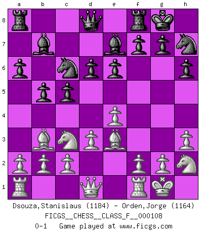 Last move : 0-1 2012 August 19 1:39:36 [Event "FICGS__CHESS__CLASS_F__000108"] [Site "FICGS"] [Date "2012.03.24"] [Round "1"] [White "Dsouza,Stanislaus"] [Black "Orden,Jorge"] [Result "0-1"] [WhiteElo "1184"] [BlackElo "1164"] 1.e4 c5 2.Nf3 d6 3.Bc4 e6 4.O-O Nf6 5.d3 Be7 6.Be3 O-O 7.Nc3 a6 8.Ng5 Nc6 9.Bb3 h6 10.Nf3 b5 11.h3 Bb7 12.Nh2 Nh7 0-1 This chess game has been lost on time (started : 2012.03.24 3:53:26) Sicilian Kingside Castling by player White (move 4) Kingside Castling by player Black (move 6) Player Black won this chess game. Follow this game move after move (download)The beauty of a move lies not in its' appearance but in the thought behind it. (Siegbert Tarrasch) Um dein Spiel zu verbessern musst du zuallererst das Endspiel studieren, denn diese kann unabhängig studiert werden. Die Eröffnung und das Mittelspiel müssen immer in Bezug gesetzt werden zum Endspiel. (José Raúl Capablanca) El Ajedrez es imaginación. (David Bronstein) Dieu déplace le joueur, et celui-ci la pièce. Quel Dieu derrière Dieu commence donc la trame ? Arturo Perez-Reverte (prix de littérature policière 1993). In every real man a child is hidden that wants to play. (Friedrich Nietzsche)