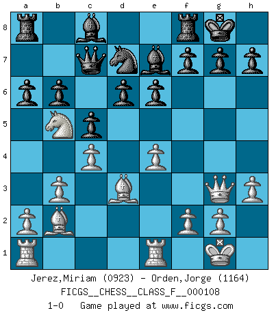 Last move : 1-0 2012 April 11 10:34:4 [Event "FICGS__CHESS__CLASS_F__000108"] [Site "FICGS"] [Date "2012.03.24"] [Round "1"] [White "Jerez,Miriam"] [Black "Orden,Jorge"] [Result "1-0"] [WhiteElo "0923"] [BlackElo "1164"] 1.e4 c5 2.c4 Nc6 3.d4 Nxd4 4.Nf3 Nxf3+ 5.Qxf3 d6 6.Nc3 Nf6 7.Bd3 e6 8.O-O Be7 9.Re1 O-O 10.h3 Qc7 11.b3 a6 12.Bb2 Nd7 13.Qg3 b6 14.Nb5 1-0 Sicilian defense Kingside Castling by player White (move 8) Kingside Castling by player Black (move 9) Player White won this chess game. Follow this game move after move (download)Chess is really ninety nine percent calculation. (Soltis) Das typische an einem Großmeister ist, daß er eine gewonnene Position schnell und schmerzlos gewinnt. (Irving Chernev) Una buena ofensiva y una buena defensa, comienzan ambas con un buen desarrollo. (Bruce A. Moon) La solitude du joueur d'Echecs à l'approche du mat est semblable à celle du condamné. (Francis Szpiner) Dave, my mind is going. I can feel it. (HAL 9000 in 2001, a space odyssey)