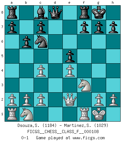 Last move : 0-1 2012 August 28 15:46:21 [Event "FICGS__CHESS__CLASS_F__000108"] [Site "FICGS"] [Date "2012.03.24"] [Round "1"] [White "Dsouza,Stanislaus"] [Black "Martinez,Silvio"] [Result "0-1"] [WhiteElo "1184"] [BlackElo "1029"] 1.e4 e5 2.Nf3 Nc6 3.Bc4 Nf6 4.d3 Bc5 5.Be3 Bxe3 6.fxe3 O-O 7.O-O d5 8.exd5 Nxd5 9.e4 Ne3 10.Qe2 Nxc4 11.dxc4 b6 0-1 This chess game has been lost on time (started : 2012.03.24 3:53:26) Two knights defense (Modern Bishop's Opening) Kingside Castling by player Black (move 6) Kingside Castling by player White (move 7) Player Black won this chess game. Follow this game move after move (download)Chess is thirty to forty percent psychology. You don't have this when you play a computer. I can't confuse it. (Judith Polgar) Ich verstehe Aljechins Kombinationen ganz gut; aber woher er diese Angriffschancen bekommt und wie er die Eröffnung behandelt das ist für mich ein Buch mit sieben Siegeln. (Rudolf Spielmann) No hay otro maestro que tenga una voluntad terrífica de ganar. Al tablero, el irradía peligro y aún los oponentes mas fuertes tienden a congelarse como liebres cuando olfatean a una pantera. Aún sus debilidades son peligrosas. Con las blancas, su juego de apertura es predecible - te es posible hacer planes en su contra - pero es tan fuerte que tus planes casi nunca funcionan. En el juego medio, su precisión e invención son fabulosas y en finales, tú simplemente no le puedes vencer. (Experto Alemán anónimo) Les échecs sont un jeu par leur forme, un art par leur essence et une science par sa difficulté d'acquisition. Ils peuvent vous procurer autant de plaisir qu'un bon livre ou une belle musique, mais vous n'aurez une réelle joie que si vous arrivez à bien jouer. (Tigran Petrosian) The problem with manipulation is that people can turn on you. (Horatio Caine, C.S.I. Miami)