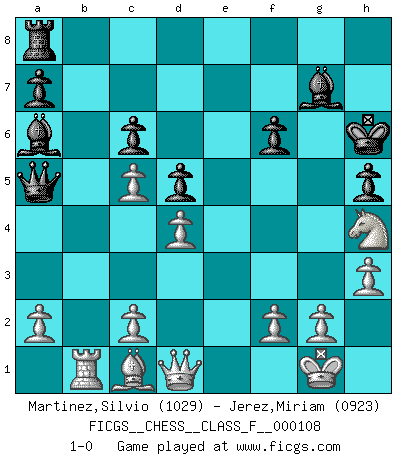 Last move : 1-0 2012 April 19 5:1:41 [Event "FICGS__CHESS__CLASS_F__000108"] [Site "FICGS"] [Date "2012.03.24"] [Round "1"] [White "Martinez,Silvio"] [Black "Jerez,Miriam"] [Result "1-0"] [WhiteElo "1029"] [BlackElo "0923"] 1.e4 Nc6 2.Nc3 Nf6 3.d4 g6 4.Nf3 Bg7 5.Bc4 O-O 6.O-O d5 7.exd5 Na5 8.b3 Nxc4 9.bxc4 c6 10.dxc6 bxc6 11.Ba3 Re8 12.h3 e6 13.Ne5 Ba6 14.Re1 Qc7 15.c5 Nd5 16.Nxd5 exd5 17.Qc1 h5 18.Rb1 f6 19.Nxg6 Rxe1+ 20.Qxe1 Kh7 21.Nh4 Kh6 22.Qd1 Qa5 23.Bc1+ 1-0 KP : Nimzovich defense Kingside Castling by player Black (move 5) Kingside Castling by player White (move 6) Player White won this chess game. Follow this game move after move (download)Of Chess it has been said that life is not long enough for it, but that is the fault of life, not Chess. (William Ewart Napier) Wenn du gegen Bobby spielst, ist es keine Frage von gewinnen oder verlieren. Es ist eine Frage des Überlebens. (Boris Vassilievich Spassky) Combinaciones deslumbrantes son para la mayoría, mover madera es para los pocos. (Georg Kieninger) Toutes choses étant égales, c'est la conviction qui gagne. Alliée à une volonté de vaincre, elle sert de détonateur, suscite des idées, disperse les doutes et aide à penser clairement. (Robert Fischer) In my experience, there's no such thing as luck. (Obi-Wan Kenobi in Star Wars ep.4)