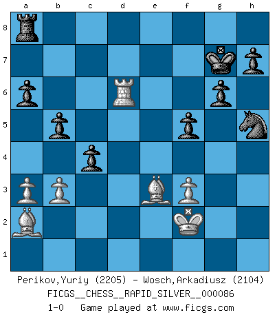 Last move : 1-0 2012 May 26 18:4:24 [Event "FICGS__CHESS__RAPID_SILVER__000086"] [Site "FICGS"] [Date "2012.03.25"] [Round "2"] [White "Perikov,Yuriy"] [Black "Wosch,Arkadiusz"] [Result "1-0"] [WhiteElo "2205"] [BlackElo "2104"] 1.d4 Nf6 2.c4 e6 3.Nf3 d5 4.Nc3 c6 5.e3 Nbd7 6.Qc2 Bd6 7.Bd3 O-O 8.O-O dxc4 9.Bxc4 b5 10.Bd3 Bb7 11.a3 a6 12.Ng5 Bxh2+ 13.Kxh2 Ng4+ 14.Kg1 Qxg5 15.f3 Ngf6 16.e4 Qh4 17.Be3 e5 18.Ne2 exd4 19.Nxd4 g6 20.Qd2 Nh5 21.Bg5 Qg3 22.Rad1 c5 23.Ne2 Qe5 24.Bb1 Bc6 25.f4 Qc7 26.e5 Ng7 27.Qc3 Rfe8 28.Rd6 Re6 29.Rd2 R6e8 30.Qh3 c4 31.Nd4 Bd5 32.Qh6 Rab8 33.Rfd1 Qc5 34.Kh2 Nxe5 35.fxe5 Rxe5 36.Kg1 Qb6 37.Be3 Qf6 38.Qf4 Qe7 39.Nf3 Bxf3 40.gxf3 Nh5 41.Qxe5 Qxe5 42.Rd8+ Qe8 43.Rxe8+ Rxe8 44.Kf2 f5 45.Rd6 Ra8 46.Ba2 Kg7 47.b3 1-0 Queen's pawn game Kingside Castling by player Black (move 7) Kingside Castling by player White (move 8) Player White won this chess game. Follow this game move after move (download)After black's reply to 1.e4 with 1..e5, leaves him always trying to get into the game. (Howard Staunton) Im Schach gibt es keinen Platz für Galanterie. (Irving Chernev) Un buen jugador siempre tiene buena suerte. (José Raúl Capablanca) J'ai vu le vaincu d'Echecs jouer des années durant dans l'espoir de la fête de la victoire. Car tu es plus riche de ce qu'elle existe si même elle n'est point pour toi. Ainsi de la perle du fond des mers. (Antoine de Saint-Exupéry) When you stop learning you start dying. (M. Scott Adams)