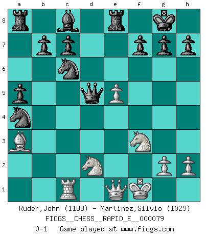 Last move : 0-1 2012 June 2 3:0:56 [Event "FICGS__CHESS__RAPID_E__000079"] [Site "FICGS"] [Date "2012.03.26"] [Round "1"] [White "Ruder,John"] [Black "Martinez,Silvio"] [Result "0-1"] [WhiteElo "1188"] [BlackElo "1029"] 1.e4 e5 2.Nf3 Nc6 3.Bc4 Nf6 4.O-O Bc5 5.Re1 O-O 6.b4 Bxb4 7.c3 Bc5 8.d4 d5 9.dxe5 Nxe4 10.Bxd5 Bxf2+ 11.Kf1 Bxe1 12.Qxe1 Qxd5 13.Nbd2 Nxc3 14.a4 a5 15.Ba3 Re8 16.Rc1 Nxa4 0-1 This chess game has been lost on time (started : 2012.03.26 11:34:14) Two knights defense Kingside Castling by player White (move 4) Kingside Castling by player Black (move 5) Player Black won this chess game. Follow this game move after move (download)When asked, -How is that you pick better moves than your opponents?, I responded: I'm very glad you asked me that, because, as it happens, there is a very simple answer. I think up my own moves, and I make my opponent think up his. (Alexander Alekhine) Wenn Dein Gegner dir ein Remis anbietet, versuch herauszufinden, weshalb er glaubt schlechter zu stehen. (Nigel Short) Tu eres para mi la Reina en d8 y yo soy el Peón en d7!!. (GM Eduard Gufeld) A ce moment-là, je menaçais de comprendre la position ! (Clément L'Heureux) Who needs drugs and alcohol if he can play Big Chess at FICGS ? (Heinz-Georg Lehnhoff)