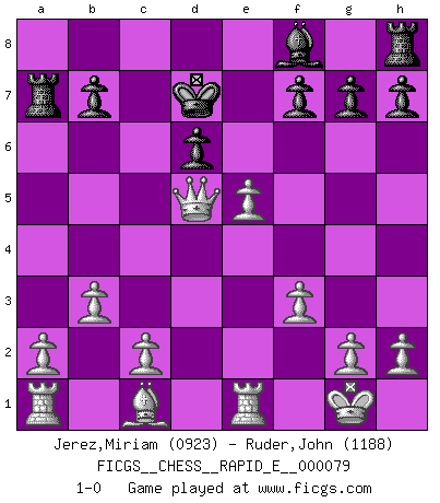 Last move : 1-0 2012 June 2 15:1:23 [Event "FICGS__CHESS__RAPID_E__000079"] [Site "FICGS"] [Date "2012.03.26"] [Round "1"] [White "Jerez,Miriam"] [Black "Ruder,John"] [Result "1-0"] [WhiteElo "0923"] [BlackElo "1188"] 1.e4 e5 2.Nf3 d6 3.Nc3 Nc6 4.d4 exd4 5.Nxd4 Nf6 6.Bb5 Bd7 7.O-O Qe7 8.Re1 Bg4 9.f3 Be6 10.Nxc6 Qd7 11.Nxa7 Rxa7 12.Bxd7+ Kxd7 13.e5 Nd5 14.Nxd5 c6 15.Nf4 Bc4 16.b3 Bd5 17.Nxd5 cxd5 18.Qxd5 1-0 This chess game has been lost on time (started : 2012.03.26 11:34:14) Philidor's defense Kingside Castling by player White (move 7) Player White won this chess game. Follow this game move after move (download)For surely of all the drugs in the world, Chess must be the most permanently pleasurable. (Assiac) Schon mancher Spieler hat aufgegeben, um zu vermeiden, daß er eine Figur verliert. (Savielly Grigorievitsch Tartakower) Sin errores no puede haber brillantez. (Emanuel Lasker) Mais n'est-ce pas déjà le limiter injurieusement que d'appeler les échecs un jeu? N'est-ce pas aussi une science, un art, ou quelque chose qui, comme le cercueil de Mahomet entre ciel et terre, est suspendu entre l'un et l'autre, et qui réunit un nombre incroyable de contraires ? (Stefan Zweig) Home computers are being called upon to perform many new functions, including the consumption of homework formerly eaten by the dog. (Doug Larson)