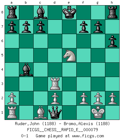Last move : 0-1 2012 April 10 19:5:13 [Event "FICGS__CHESS__RAPID_E__000079"] [Site "FICGS"] [Date "2012.03.26"] [Round "1"] [White "Ruder,John"] [Black "Bromo,Alexis"] [Result "0-1"] [WhiteElo "1188"] [BlackElo "1188"] 1.e4 e5 2.Nf3 Nc6 3.Bc4 h6 4.O-O Nf6 5.Re1 Bb4 6.Nc3 Bxc3 7.Re3 Ba5 8.b4 Bxb4 9.Rb3 d5 10.Bxd5 Nxd5 11.exd5 Qxd5 12.Rd3 Qc4 13.Qe2 Qxc2 14.Qxe5+ Nxe5 15.Nxe5 Qd1+ 0-1 King's pawn game Kingside Castling by player White (move 4) Player Black won this chess game. Follow this game move after move (download)The hardest game to win is a won game. (Emanuel Lasker) Warum muß ich gegen diesen IDIOTEN verlieren? (Aaron Nimzowitsch) Si tu oponente te ofrece un empate, trata de averiguar porque piensa él que esta en una posición peor. (Nigel Short) Echiquier : carré parfait, comme la Jérusalem nouvelle décrite par l'auteur de l'Apocalypse, huit cases sur huit, exaltation du chiffre 4, symbole du cosmos aux quatre horizons... où le noir et le blanc, l'ombre et la lumière, le mal et le bien s'entremêlent et se conjuguent. (Robert Couffignal, Le Gambit du poète) . 'gn is not allowed in chess unless n is an integer between 1 and 8 inclusive, where 1 and 8 are to interpreted as the standard numerals standing for integers in the ordered real-closed field R, with the *canonical* ordering. (As opposed to, say, an integer in the domain Z[2+i*sqrt(5)] or an integer in some exotic Grothendieck topos). (Normajean Yates)