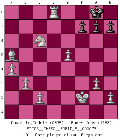 Last move : 1-0 2012 April 29 21:48:7 [Event "FICGS__CHESS__RAPID_E__000079"] [Site "FICGS"] [Date "2012.03.26"] [Round "1"] [White "Cavaille,Cedric"] [Black "Ruder,John"] [Result "1-0"] [WhiteElo "0935"] [BlackElo "1188"] 1.e4 e5 2.Nf3 d6 3.Bc4 Nf6 4.Ng5 d5 5.exd5 Bc5 6.Nc3 O-O 7.Nf3 Re8 8.O-O Ng4 9.Qe2 Bf5 10.d3 Bxf2+ 11.Rxf2 Nxf2 12.Kxf2 c6 13.dxc6 bxc6 14.g3 e4 15.dxe4 Be6 16.Bxe6 Rxe6 17.Qd2 Qxd2+ 18.Bxd2 a5 19.a4 c5 20.e5 Nc6 21.Bf4 Nd4 22.Nxd4 Rb6 23.b3 cxd4 24.Nd5 Rc6 25.Ne7+ Kf8 26.Nxc6 Rc8 27.Nxd4 Rd8 28.Nc6 Rd2+ 29.Bxd2 Kg8 30.Bxa5 Kh8 31.Rd1 Kg8 32.Rd8+ 1-0 Philidor's defense Kingside Castling by player Black (move 6) Kingside Castling by player White (move 8) Player White won this chess game. Follow this game move after move (download)The isolated Pawn casts gloom over the entire chessboard. (Aaron Nimzovich) Spielt Blackmar-Diemer-Gambit, und das Matt kommt von selbst! (Emil Joseph Diemer) No solamente yo pronostico su triunfo sobre Botvinnik, sino que me adelanto y digo que probablemente Fischer es el jugador de Ajedrez mas grande que haya existido. (John Collins) Il n'y a pas eu de défaite parce que je ne crois pas que cet ordinateur ait jamais existé. IBM a triché en refusant d'imprimer les modes de recherche de la machine. C'est évident, pendant le match, des coups décisifs ont été joués par des êtres humains. Aujourd'hui, les meilleurs spécialistes en informatique ne peuvent toujours pas expliquer comment Deep-Blue a pu jouer contre la logique des ordinateurs. IBM a gagné une guerre de communication, mais ils sont incapables de prouver que l'ordinateur a gagné tout seul. (Garry Kasparov) Thibault, I ask for draw. Game 13876. - Sorry Ilmars, you won. (FICGS chat)