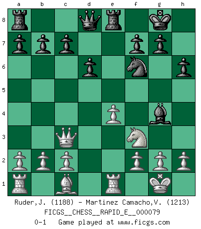 Last move : 0-1 2012 May 18 1:30:20 [Event "FICGS__CHESS__RAPID_E__000079"] [Site "FICGS"] [Date "2012.03.26"] [Round "1"] [White "Ruder,John"] [Black "Martinez Camacho,Victor Hugo"] [Result "0-1"] [WhiteElo "1188"] [BlackElo "1213"] 1.e4 e5 2.Nf3 Nc6 3.Bc4 Nf6 4.O-O Bc5 5.Nc3 O-O 6.Ng5 d6 7.Re1 h6 8.Nf3 Bg4 9.d4 Bb4 10.dxe5 Nxe5 11.Qe2 Nxc4 12.Qxc4 Bxc3 13.Qxc3 Re8 0-1 This chess game has been lost on time (started : 2012.03.26 11:34:14) Two knights defense Kingside Castling by player White (move 4) Kingside Castling by player Black (move 5) Player Black won this chess game. Follow this game move after move (download)Blessed be the memory of him who gave the world this immortal game. (A. G. Gardiner) Ich hatte meine größten Erfolge, als ich 47 Jahre alt war. Kasparow war noch nicht mal 42 und hat das Schach schon im Stich gelassen. (Viktor Kortschnoi) A través de las casillas del tablero, los Indios explican el movimiento del tiempo y la edad, las influencias mas altas que controlan el mundo y los lazos que vinculan al Ajedrez con el alma humana. (Al-Masudi) Nous vivons dans un monde échiquéen : chaque jour qui passe est un défi à relever. (Philosophe Sasha) Art disturbs, science reassures. (Georges Braque, Le Jour et la Nuit)