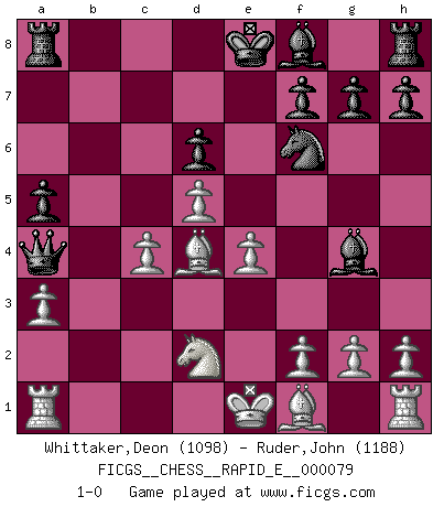 Last move : 1-0 2012 May 19 1:38:13 [Event "FICGS__CHESS__RAPID_E__000079"] [Site "FICGS"] [Date "2012.03.26"] [Round "1"] [White "Whittaker,Deon"] [Black "Ruder,John"] [Result "1-0"] [WhiteElo "1098"] [BlackElo "1188"] 1.e4 e5 2.Nf3 d6 3.d4 Nc6 4.a3 Be6 5.d5 Bg4 6.c4 Nd4 7.Nbd2 b5 8.b3 bxc4 9.bxc4 Nf6 10.Qa4+ Qd7 11.Qb4 a5 12.Qc3 Qa4 13.Nxd4 exd4 14.Qxd4 c5 15.Bb2 cxd4 16.Bxd4 1-0 This chess game has been lost on time (started : 2012.03.26 11:34:14) Philidor's defense Player White won this chess game. Follow this game move after move (download)Fischer wanted to give the Russians a taste of their own medicine. (Larry Evans) Offener Brief an US-Präsident Bush anlässlich der Verhaftung Bobby Fishers: Verhaften Sie mich. Stecken Sie mich in dieselbe Zelle wie Bobby Fisher und geben Sie uns ein Schachspiel mit. (Boris Vassilievich Spassky) Existen dos clases de sacrificios: los correctos y los míos. (Mikhail Tal) La guerre est enfant de la passion, la passion est enfant du narcissisme et le narcissisme est l'enfant. (...) Une autre partie ? (Thibault de Vassal) There is no vagueness without wind. (Chinese proverb)
