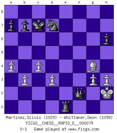 Last move : 0-1 2012 May 15 10:52:15 [Event "FICGS__CHESS__RAPID_E__000079"] [Site "FICGS"] [Date "2012.03.26"] [Round "1"] [White "Martinez,Silvio"] [Black "Whittaker,Deon"] [Result "0-1"] [WhiteElo "1029"] [BlackElo "1098"] 1.e4 e5 2.Nf3 Nc6 3.Nc3 d5 4.exd5 Nb4 5.Bc4 Bg4 6.O-O c6 7.dxc6 Nxc6 8.d3 Nf6 9.h3 Bxf3 10.Qxf3 Be7 11.Re1 h6 12.a4 Qc7 13.b3 Bb4 14.Bd2 Nd4 15.Qg3 O-O-O 16.Rxe5 Bd6 17.Qxg7 Bxe5 18.Qxf7 Rhf8 19.Qe6+ Nxe6 20.Bxe6+ Nd7 21.Re1 Bxc3 22.Bxc3 Qxc3 23.Re2 Qf6 24.Bg4 Kc7 25.Kh1 Rde8 26.Rxe8 Rxe8 27.c4 Re1+ 28.Kh2 Qf4+ 29.g3 Qxf2+ 0-1 Three knights game Kingside Castling by player White (move 6) Queenside Castling by player Black (move 15) Player Black won this chess game. Follow this game move after move (download)Chess is a cold bath for the mind. (Sir John Simon) Rubinstein ist ein Turmendspiel, welches die Götter vor tausenden von Jahren begannen. (Savielly Grigorievitsch Tartakower) Sin errores no puede haber brillantez. (Emanuel Lasker) Le temps de noter son nom sur la feuille de partie, j'étais déjà en zeitnot ! D'un modeste amateur apparié lors de la première ronde d'un open contre le grand-maître Azmaïparashvili. If only faces could talk... (Pat Summerall, Sportscaster during the Super Bowl)