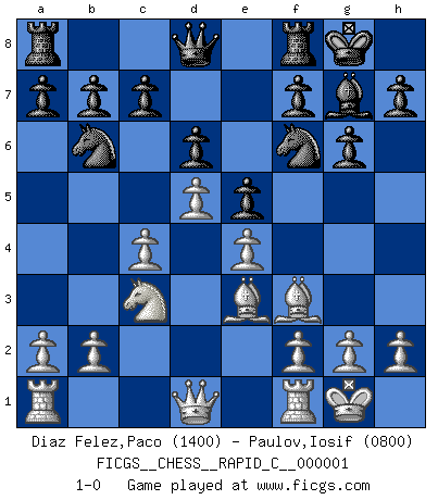 Last move : 1-0 2006 May 21 20:12:44 [Event "FICGS__CHESS__RAPID_C__000001"] [Site "FICGS"] [Date "2006.05.12"] [Round "1"] [White "Diaz Felez,Paco"] [Black "Paulov,Iosif"] [Result "1-0"] [WhiteElo "1400"] [BlackElo "0800"] 1.d4 Nf6 2.c4 g6 3.Nc3 Bg7 4.e4 d6 5.Nf3 Bg4 6.Be2 O-O 7.Be3 Nbd7 8.O-O Bxf3 9.Bxf3 e5 10.d5 Nb6 1-0 King's Indian : 5.Nf3 Kingside Castling by player Black (move 6) Kingside Castling by player White (move 8) Player White won this chess game. Follow this game move after move (download)No one ever won a game by resigning. (Unknown) Die FIDE ist dabei in die Hände der russischen Mafia zu fallen. (Larry Evans) No existe un remordimiento como el remordimiento del Ajedrez. (H. G. Wells) Les sacrifices démontrent seulement que quelqu'un a gaffé. (Savielly Tartacover) Bobby never cared about money, though. His only desire was to prove that his choices were correct: He wanted chess to be important because he was a chess player, and he wanted to be important. Bobby knew money was important, but he didn't have a clue why, outside of clothes and status. The only way he could accomplish what he wanted was to fight for a lot of money. Once he got it, he gave it away. He did not know how to spend it. And once he'd become champion, after, essentially, sacrificing his life for it, he didn't know how to spend his time. (Bob Wade)