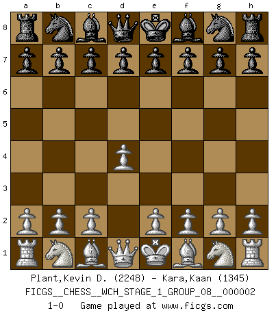 Last move : 1-0 2007 February 18 17:5:43 [Event "FICGS__CHESS__WCH_STAGE_1_GROUP_08__000002"] [Site "FICGS"] [Date "2007.01.16"] [Round "1"] [White "Plant,Kevin D."] [Black "Kara,Kaan"] [Result "1-0"] [WhiteElo "2248"] [BlackElo "1345"] 1.d4 1-0 This chess game has been lost on time (started : 2007.01.16 15:19:21) Queen's pawn Player White won this chess game. Follow this game move after move (download)No price is too great for the scalp of the enemy King. (Koblentz) Gewinnen beim Schach fördert das Selbstvertrauen. Beim Sex spüre ich sowas nicht... (Garry Kasparov) Muchos se han convertido en Maestros de Ajedrez, nadie se ha convertido en el Maestro del Ajedrez. (Siegbert Tarrasch) La vérité est comme le meilleur coup aux échecs : elle existe, mais il faut la chercher. (Arturo Perez-Reverte) If you lose the game you should win the analysis! (Proverb)
