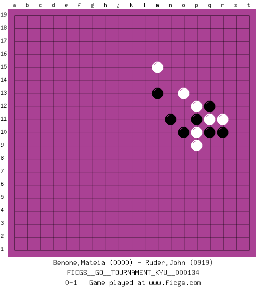 Last move : 0-1 2012 June 5 3:9:35 [Event "FICGS__GO__TOURNAMENT_KYU__000134"] [Site "FICGS"] [Date "2012.03.27"] [Round "1"] [Black "Benone,Mateia"] [White "Ruder,John"] [Result "0-1"] [Rating 1 "0000"] [Rating 2 "0919"] 1.q10 o13 2.n11 m15 3.m13 p10 4.p11 q11 5.o10 p9 6.q12 r11 7.r10 p12 0-1 This go game has been lost on time (started : 2012.03.27 21:59:54) Here are the names of the openings (joseki) played in the four corners : Corner q16 : o13 n11 This joseki is unknown. A weak or weird move has probably been played in this corner. Corner q4 : p9 0-1 This joseki is unknown. A weak or weird move has probably been played in this corner. Player White won this Go (weiqi, baduk) game. Follow this game move after move (download)Empty triangles are bad. (Anonymous) The problem with manipulation is that people can turn on you. (Horatio Caine, C.S.I. Miami)