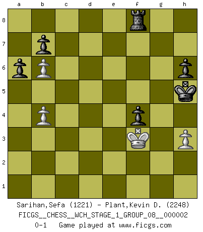 Last move : 0-1 2007 May 2 9:53:6 [Event "FICGS__CHESS__WCH_STAGE_1_GROUP_08__000002"] [Site "FICGS"] [Date "2007.01.16"] [Round "1"] [White "Sarihan,Sefa"] [Black "Plant,Kevin D."] [Result "0-1"] [WhiteElo "1221"] [BlackElo "2248"] 1.e4 e5 2.f4 exf4 3.Nf3 g5 4.Bc4 Nc6 5.O-O d6 6.d4 h6 7.c3 Nf6 8.Nbd2 Bg7 9.h3 O-O 10.b4 Nh5 11.Re1 Ng3 12.a4 Re8 13.Qb3 Qf6 14.a5 a6 15.e5 dxe5 16.dxe5 Nxe5 17.Nxe5 Rxe5 18.Bb2 Re3 19.Nf3 Bxh3 20.Bxf7+ Qxf7 21.Qxf7+ Kxf7 22.Rxe3 fxe3 23.gxh3 Ne2+ 24.Kh2 Nf4 25.Rd1 e2 26.Rd7+ Kg6 27.Rxc7 Nd3 28.Re7 Nxb2 29.Rxe2 Bxc3 30.Re6+ Kh5 31.Rb6 Rb8 32.Kg2 Nd3 33.Ng1 Nf4+ 34.Kf3 Bd4 35.Ne2 Bxb6 36.Nxf4+ gxf4 37.axb6 Rf8 0-1 KGA : Blachly gambit Kingside Castling by player White (move 5) Kingside Castling by player Black (move 9) 10 pieces endgame at move 37 : White KPPP , Black KRPPPP WHITE : King + 3 Pawns BLACK : King + 1 Rook 4 Pawns Player Black won this chess game. Follow this game move after move (download)A great player and a great example for many. His book My 60 Memorable Games had a big impact on me. It is a shame he didn't continue to enrich the world of chess with his unparalleled understanding after 1972. (Jan Timman, about Bobby Fischer's death) Das Zentrum ist der Balkan des Schachbretts - Kriegshandlungen können in jedem Moment ausbrechen. (Aaron Nimzowitsch) Las combinaciones han sido siempre el aspecto más intrigante del Ajedrez. Los Maestros las buscan, el público las aplauden, los críticos las alaban. La razón se debe a que las combinaciones hacen posible que el Ajedrez sea más que un ejercicio matemático con una carencia de vida. Ellas son la poesía del juego, son del Ajedrez lo que la melodía es de la música. Ellas representan el triunfo de la mente sobre la materia. (Reuben Fine) A chaque perte on perd un peu de soi. (Joël Lautier) After growing wildly for years, the field of computing appears to be reaching its infancy. (John Pierce)