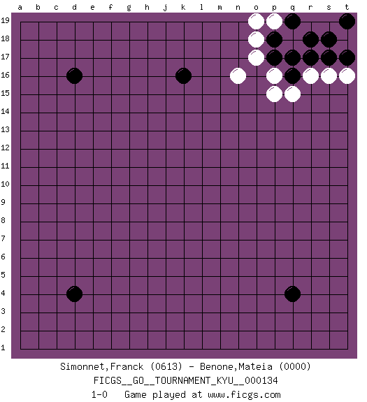 Last move : 1-0 2012 May 25 14:15:7 [Event "FICGS__GO__TOURNAMENT_KYU__000134"] [Site "FICGS"] [Date "2012.03.27"] [Round "1"] [Black "Simonnet,Franck"] [White "Benone,Mateia"] [Result "1-0"] [Rating 1 "0613"] [Rating 2 "0000"] 1.q16 p16 2.p17 p15 3.q4 o17 4.p18 o18 5.d16 r16 6.r17 s16 7.s17 q15 8.q17 p19 9.q19 t16 10.t17 t18 11.s18 s19 12.t19 r19 13.r18 o19 14.d4 n16 15.k16 1-0 This go game has been lost on time (started : 2012.03.27 21:59:54) Here are the names of the openings (joseki) played in the four corners : Corner q16 : q16 p16 Hoshi (Hwajeom, Seongjeom, Xingwei`) 4-4 Point. The star or hoshi (4-4) point, emphasizing influence at the potential expense of territory. Player Black won this Go (weiqi, baduk) game. Follow this game move after move (download)The possibility or impossibility of an event results logically from the rules. (Pierre Audouard) Life is the sum of all your choices. (Albert Camus)
