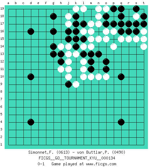 Last move : 0-1 2012 October 11 21:46:12 [Event "FICGS__GO__TOURNAMENT_KYU__000134"] [Site "FICGS"] [Date "2012.03.27"] [Round "1"] [Black "Simonnet,Franck"] [White "von Buttlar,Paul"] [Result "0-1"] [Rating 1 "0613"] [Rating 2 "0490"] 1.q16 p16 2.p17 q15 3.r16 o15 4.d16 o16 5.o17 p14 6.q4 n15 7.d4 n17 8.o18 n18 9.k17 m16 10.g16 r15 11.s16 s15 12.d10 t16 13.t17 s18 14.s17 o19 15.p19 n19 16.q18 r18 17.r17 t18 18.q17 r19 19.s19 t19 20.t15 t14 21.q19 t16 22.s19 t15 23.q10 s18 24.t18 j17 25.j16 j18 26.k18 k19 27.k16 k15 28.j15 j14 29.g14 l19 30.g18 l16 31.l17 m17 32.h13 h14 33.k14 j13 34.l15 m15 35.l13 m14 36.m13 l14 37.k15 k13 38.k12 j12 39.h12 j11 40.k11 h11 41.g13 j10 42.k10 k9 43.j9 l12 44.n13 l10 45.m12 l11 46.m11 m10 47.o11 n10 48.o12 o10 0-1 This go game has been lost on time (started : 2012.03.27 21:59:54) Here are the names of the openings (joseki) played in the four corners : Corner q16 : q16 p16 Hoshi (Hwajeom, Seongjeom, Xingwei`) 4-4 Point. The star or hoshi (4-4) point, emphasizing influence at the potential expense of territory. Player White won this Go (weiqi, baduk) game. Follow this game move after move (download)Atari, atari is vulgar play. (Anonymous) A government big enough to give you everything you want is strong enough to take everything you have. (Thomas Jefferson)